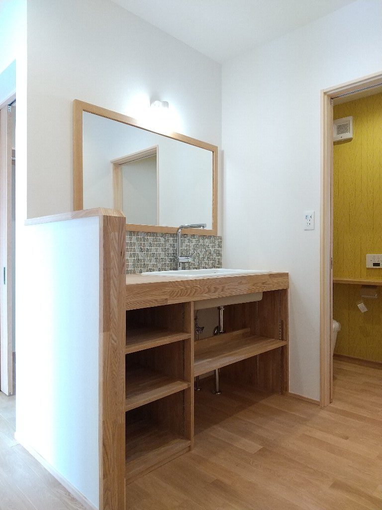 ダイニングの近くには、今注目の3畳のファミリークローク。その奥に洗面、トイレと続きます。洗面を通り過ぎるとキッチンにもつながる3畳の脱衣室。家事動線もいい感じです👍