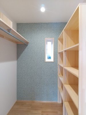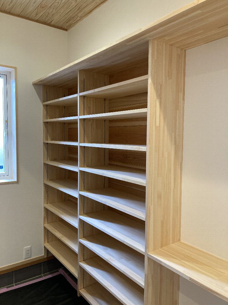 玄関の横にはシューズクローク。シューズクロークにはコートを掛ける事が出来るスペースもあり、これは非常に便利です。花粉症の方は花粉を室内に持ち込むことがなく、ここでシャットアウトできますね👍シューズクロークの後ろには、外から使える外部収納もあります。大工道具やタイヤ、w邉棟梁が最近はまっている釣り道具などのアウトドア用品も入れておくことができます。