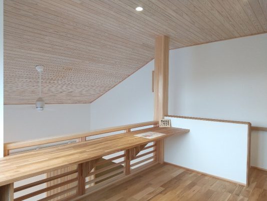 階段を上ると吹き抜けに面したスタディ―コーナー。勉強熱心な奥様のスペースだそうです。
