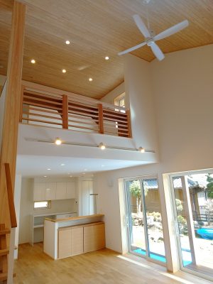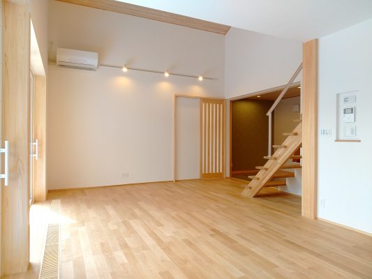 勾配天井とロフト風の2階が印象的なリビングです。床材はナラ材を使用しています。