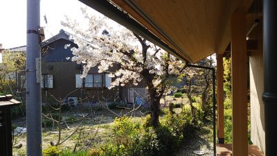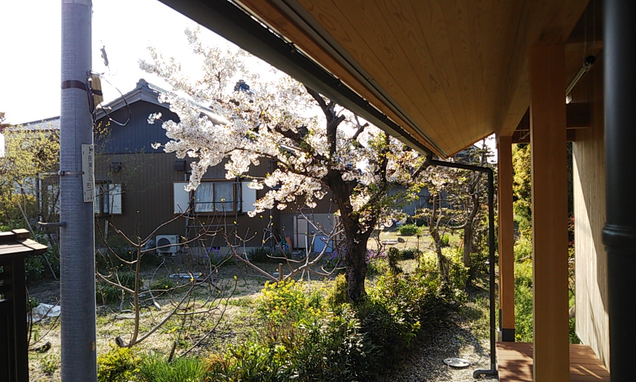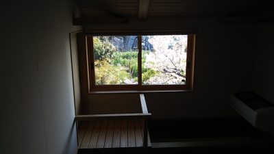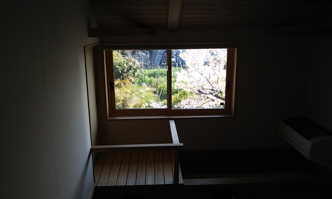 時期的にちょうど隣地に立つ桜の木が満開を迎え、取材の写真撮影に文字通り花を添えます。昨年はまだ工事中で足場シート越しにしか見ることができませんでしたが、リビングや2階の廊下、キャットウォークからその姿を見ることができます。陽が落ちたらハロゲンライトを下から焚き、室内の灯りをすべて落とせば夜桜が楽しめそうです。よくぞこの位置に立っていてくれた、と隣地の方にも感謝します。