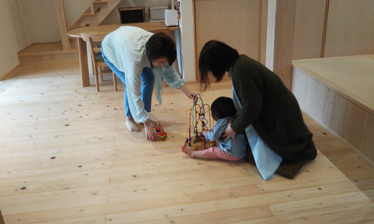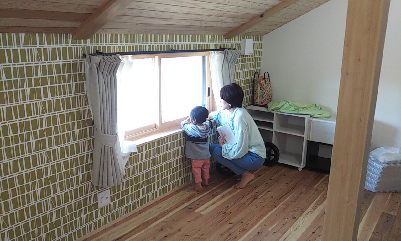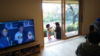 奥様とkちゃんにも撮影モデルとして入っていただき、より臨場感、リアリティを持たせた構図としています。デッキで桜の木をバックにシャボン玉のおもちゃで遊ぶkちゃん。こういうショットを撮ってもらいたいために、花が散ってしまう前に取材日を決めて正解でした。