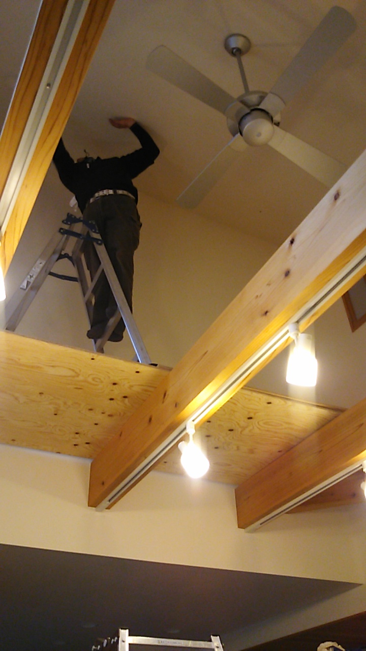 OBのお客様から、ある特別な『極秘ミッション』を受け、リビングの梁の上に足場を組んで作業しています。