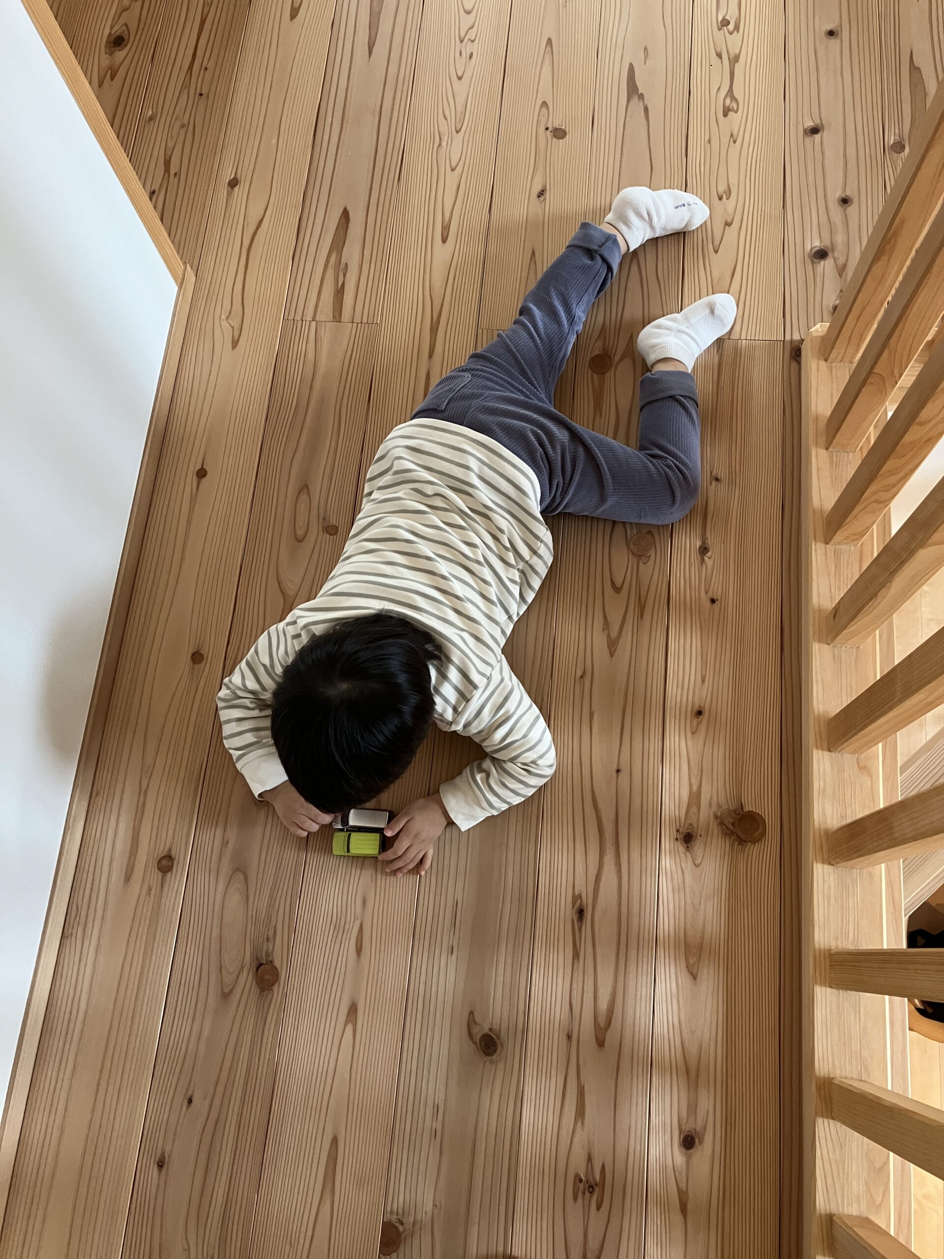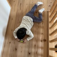 a君も、2階の床をほふく前進で点検中?無垢の床板は小さなお子さんは気持ちが良いようで、こんな風にくつろぎモードになる子を見学会でもよく見かけます。a君にも久しぶりにお会いしましたが、日本語を話されるようになり、可愛さはそのままで少しすらっとして、赤ちゃんから子供に成長されていました👍