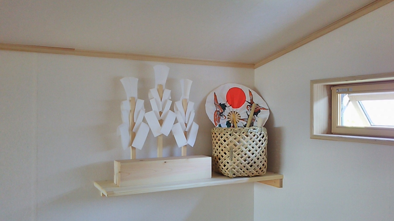 昨年末に竣工しましたh様邸の上棟の祀りものを収める棚を取付けにうかがいました。 本来は小屋裏空間に収めますが、ここは小屋裏も収納として使っているため、壁の一角に棚を設けることにしました。 棟礼も柱に取り付け。 また飾 […]