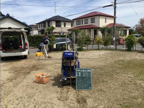 地盤調査を行いました。スウェーデンサウンディングという試験方法です。 重りをつけたロッドを地面に貫入させ、抵抗によって地盤の硬軟を測ります。