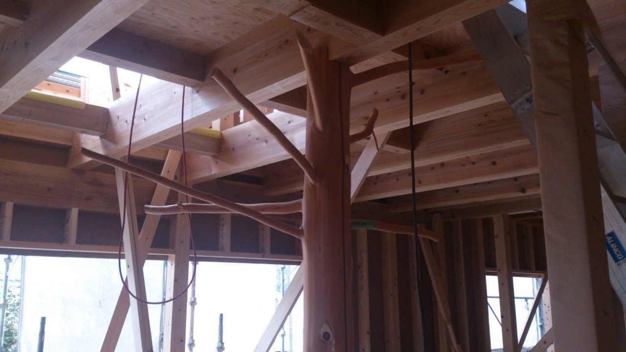 とある現場の柱です。 住宅の中に樹木が生えているのではありません。 丸太の柱なのですが、枝が残ったままになっています。 部屋のインテリアとしてもなかなか面白いかもしれません。