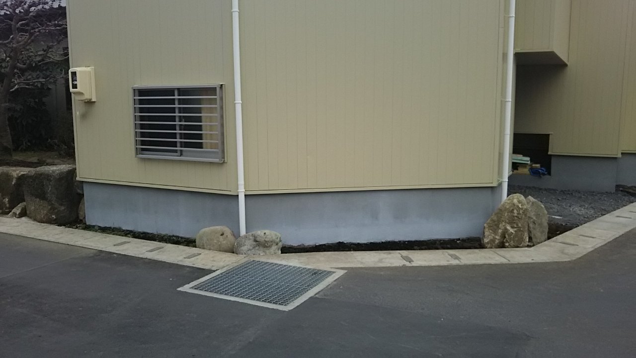 道路隅切りの部分にももれなく植栽が植えられています。ここから外壁に蔦など絡んでいったら面白い外観になるかもしれません。
