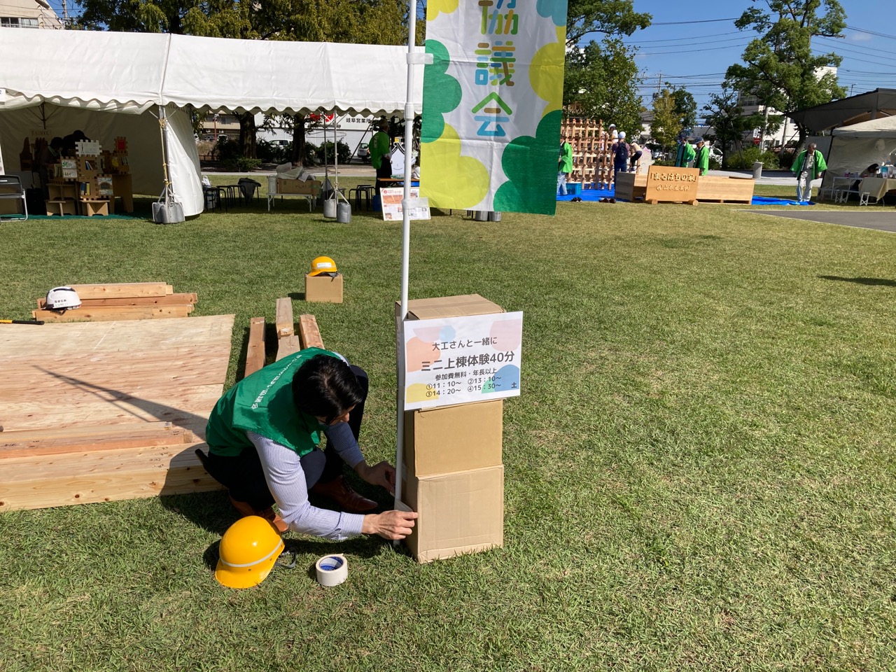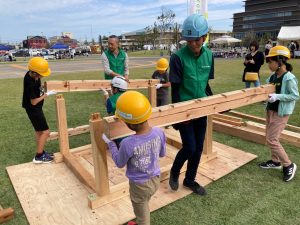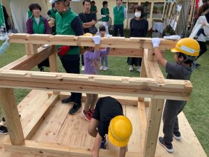 人数に物を言わせて行うもう一つの出し物は子供用『ミニ上棟式』です。小屋組みのミニチュア(と言っても使う材料は原寸です)を用意し、スタッフの手伝いでお子さんに棟上げをしてもらうという、労働基準法も真っ青のイベントです。