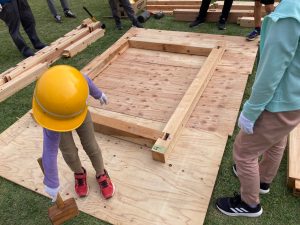 梁桁も組み上げていきますが、何しろ材料そのものは原寸ですので、お子さんの肩には少し重いため、ある程度スタッフが一緒に運んだりしています。