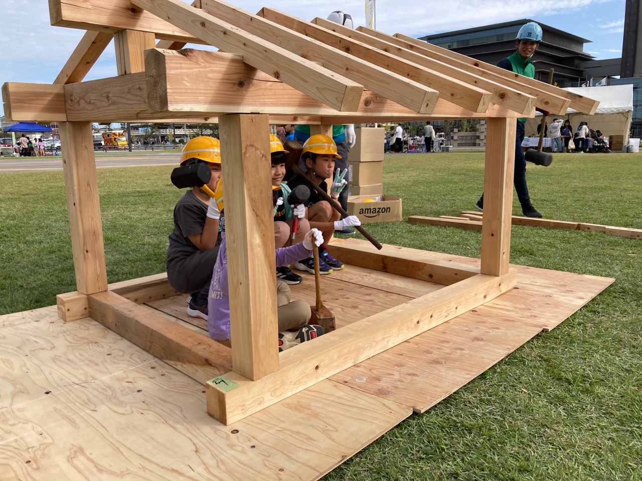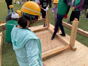 垂木をかけて上棟までは完成。できあがった『住宅』の中に入って記念撮影。『仕事』の後の充実の表情です。この日参加したお子さんの中に2名ほど『将来は大工さんになりたい』『モノづくりをしたい』という子がいました。こういうイベントが貴重な体験になってくれたら良いですね。