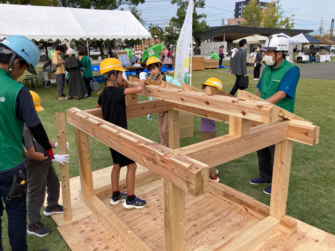 ミニチュアとは言え本格的な仕口を施した材料を順番通りに組み上げて建物を建てていく様子は、お子さんの目には興味深いものがあるようです。