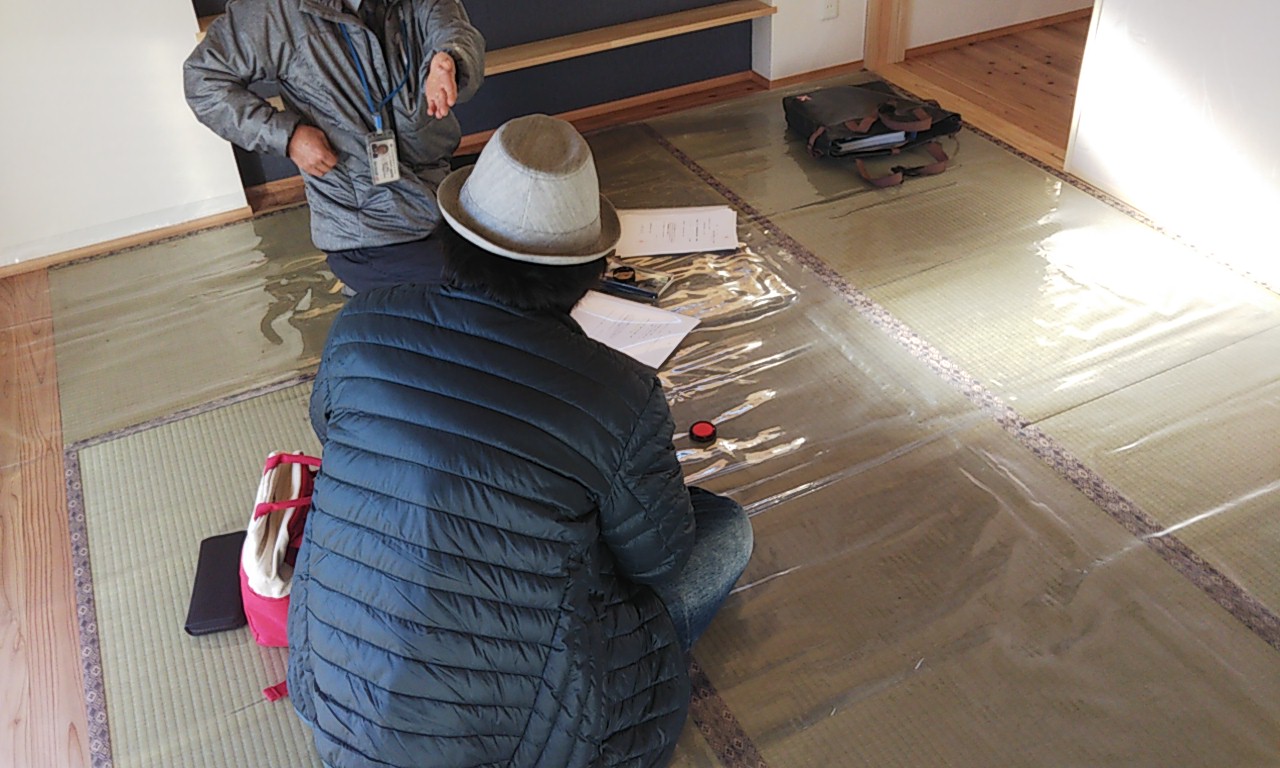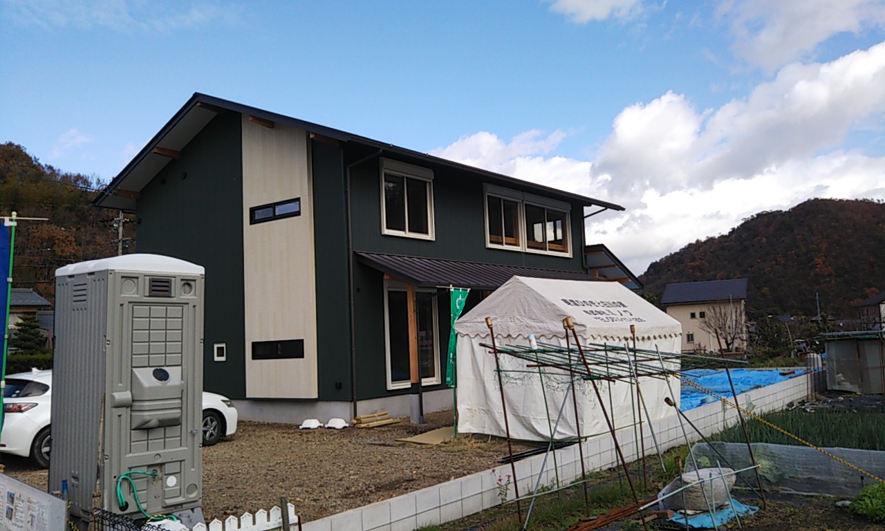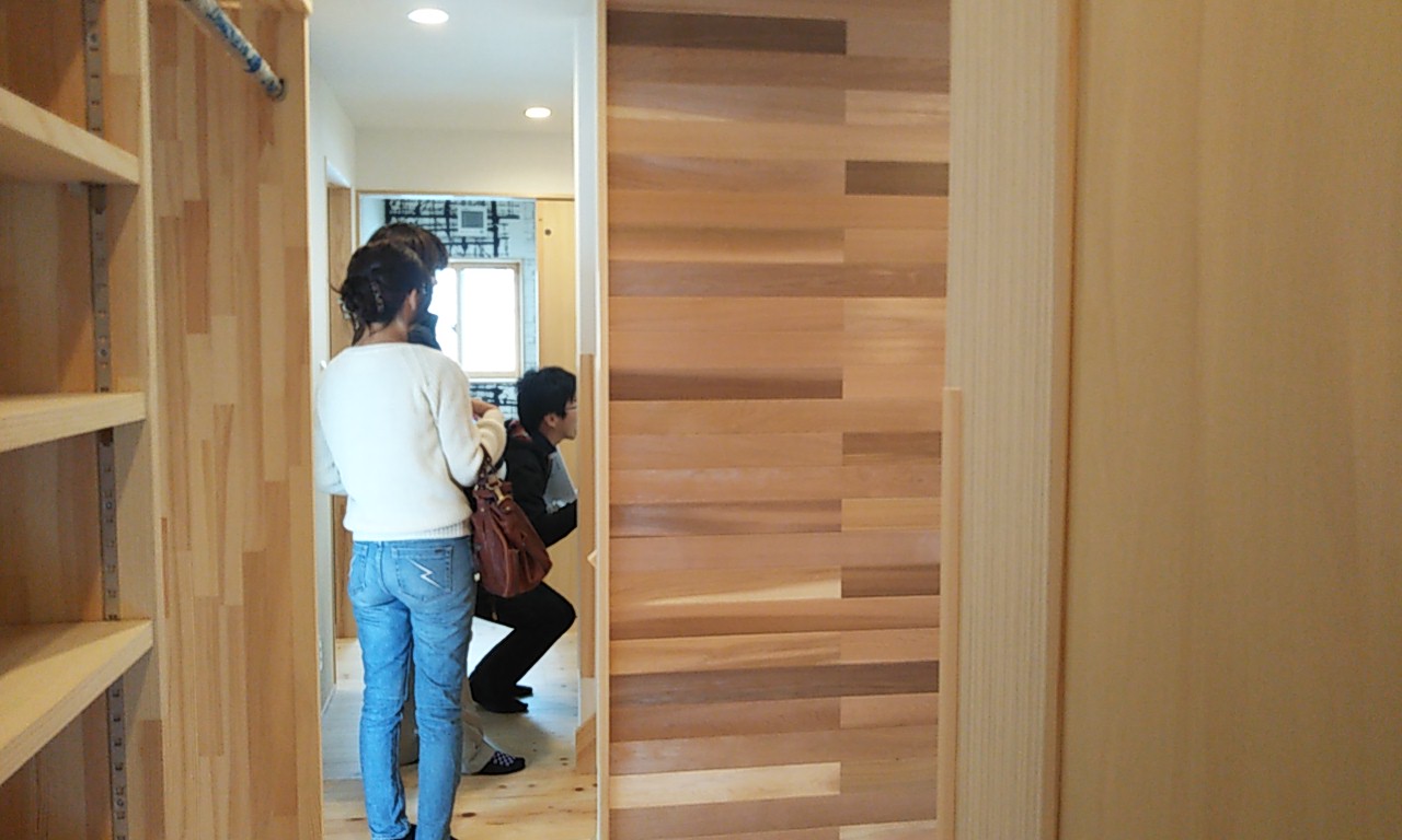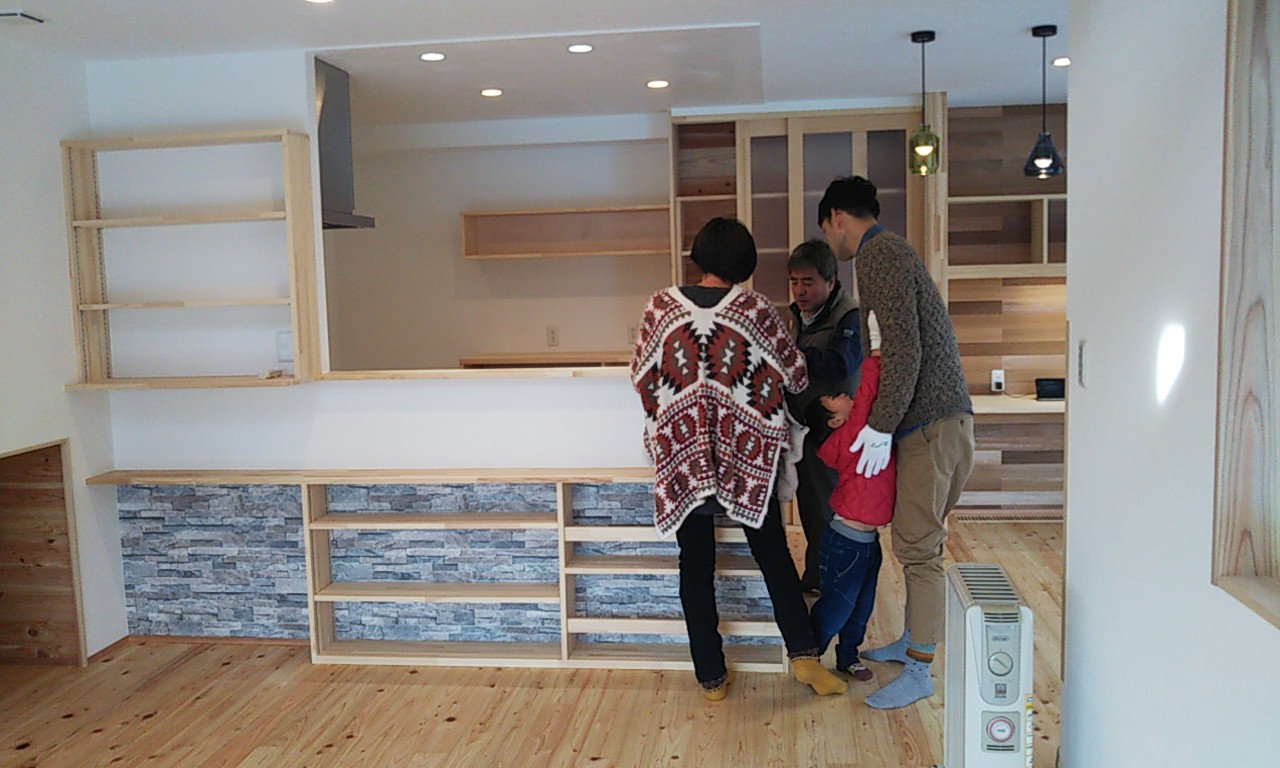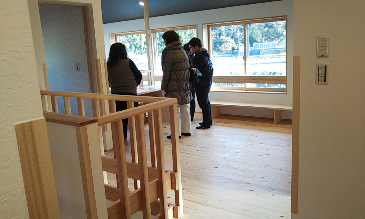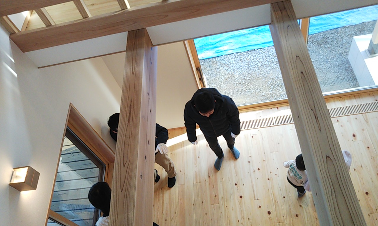 工程の都合上、エアコンの無い中での開催となりましたが、事務所から持って行ったオイルヒーター1台、温風のヒーター1台と浴室の暖房機を運転しているだけで屋内は暖か。かえって断熱の威力が良く実感できる状況となりました。k様も見学会にお越しになり、実際に体感し、『エアコンの台数は予定しているほど要らないのでは?』と、また検討のタネができました。