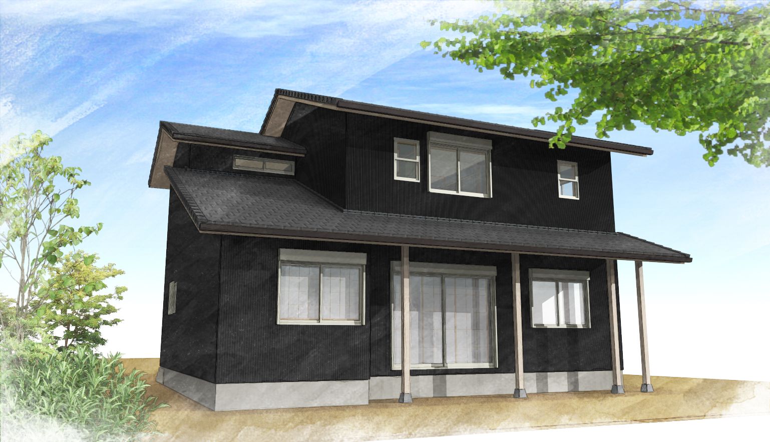 モダン和風のシンプルな外観の建物です。内装にも無垢材をふんだんにに使用し、