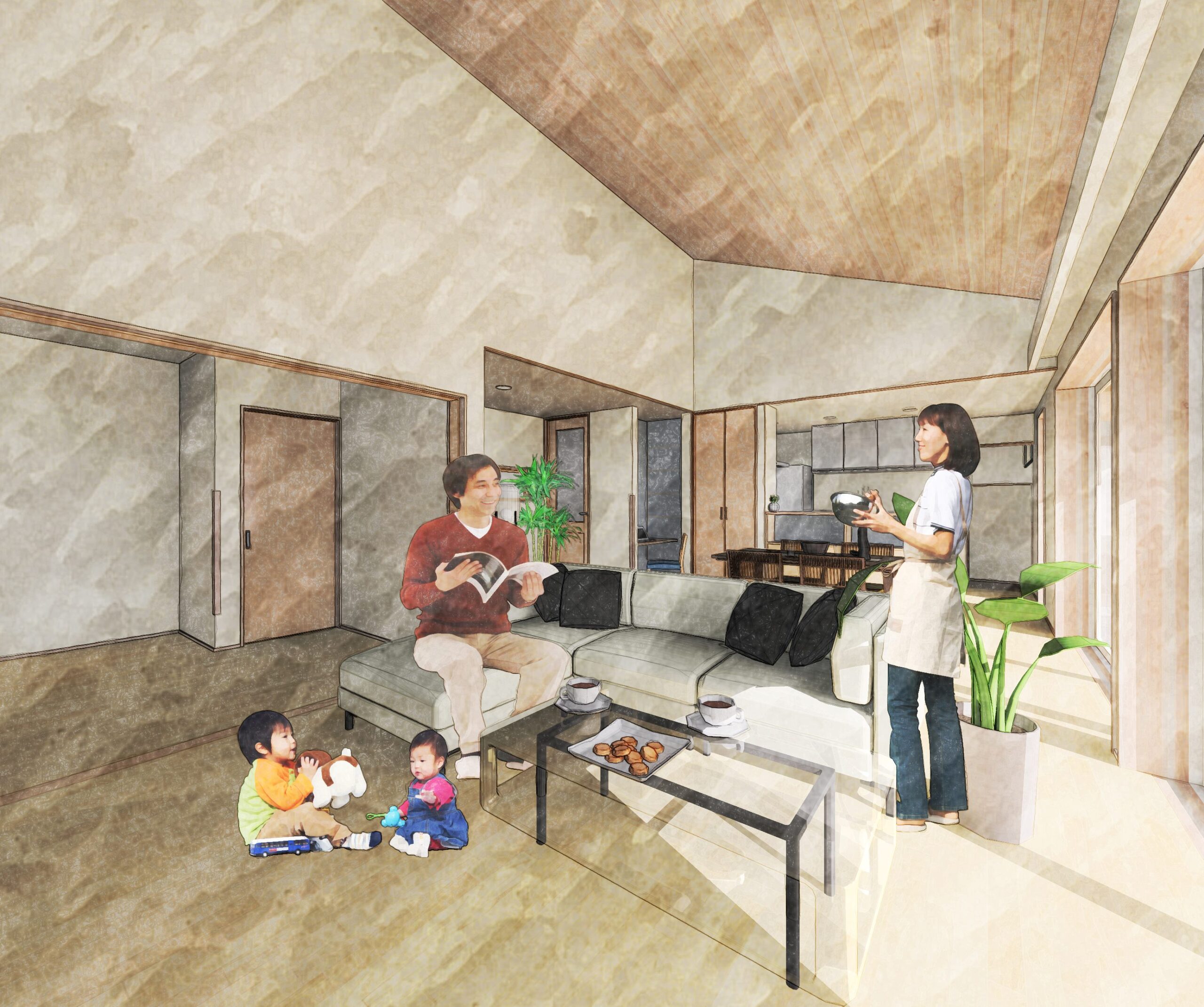 気になる性能は、天井と屋根に310㎜の断熱、壁に付加断熱55㎜を施し、ダクト式熱交換換気扇や、太陽光パネル6kwを採用され、エネルギー収支ゼロのZEH仕様です。冬は太陽光を取り入れて、夏は光を遮り、少ないエネルギーで、家中どこにいても気持ちよく過ごしていただけます。