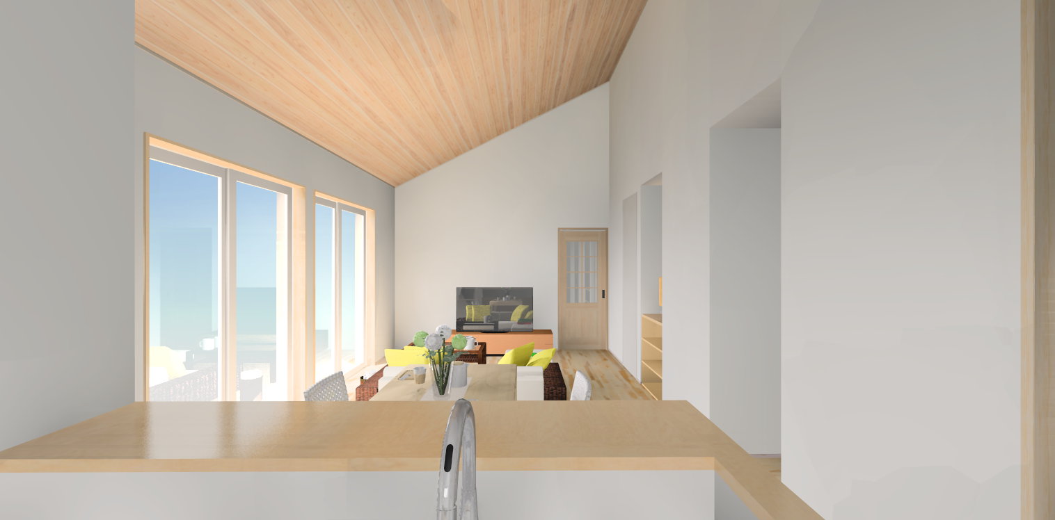 LDKの勾配天井や、小屋裏を活かした収納は平屋ならでは。LDKと水廻りが回遊式で空気が循環しやすく、二世帯のプライバシーにも配慮した間取りになっています。適所に設けられた収納は、使い勝手がよさそうです。性能は、120㎜充填断熱、複合サッシですが、UA値は0.4で断熱等級6をクリアしています。熱交換換気扇は採用していませんが、工夫次第で快適に過ごしていただけると思います。