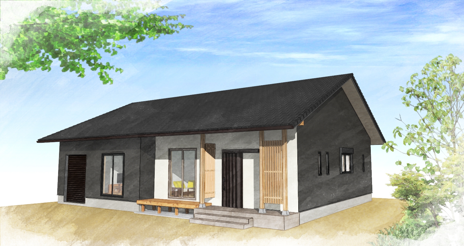 今回は、43.67坪の平屋住宅です。バイク用インナーガレージや、玄関ホールから出入りできる和室、LDKの勾配天井と繋がるロフト空間など、お施主様のこだわりが形になりました。水廻りも集約されて家事動線も短く使い勝手の良い間取りになっています。東濃ひのき柱がポイントの玄関には、天井に桧の羽目板を採用されて、一段と良い木の香りを味わっていただく事もできます。