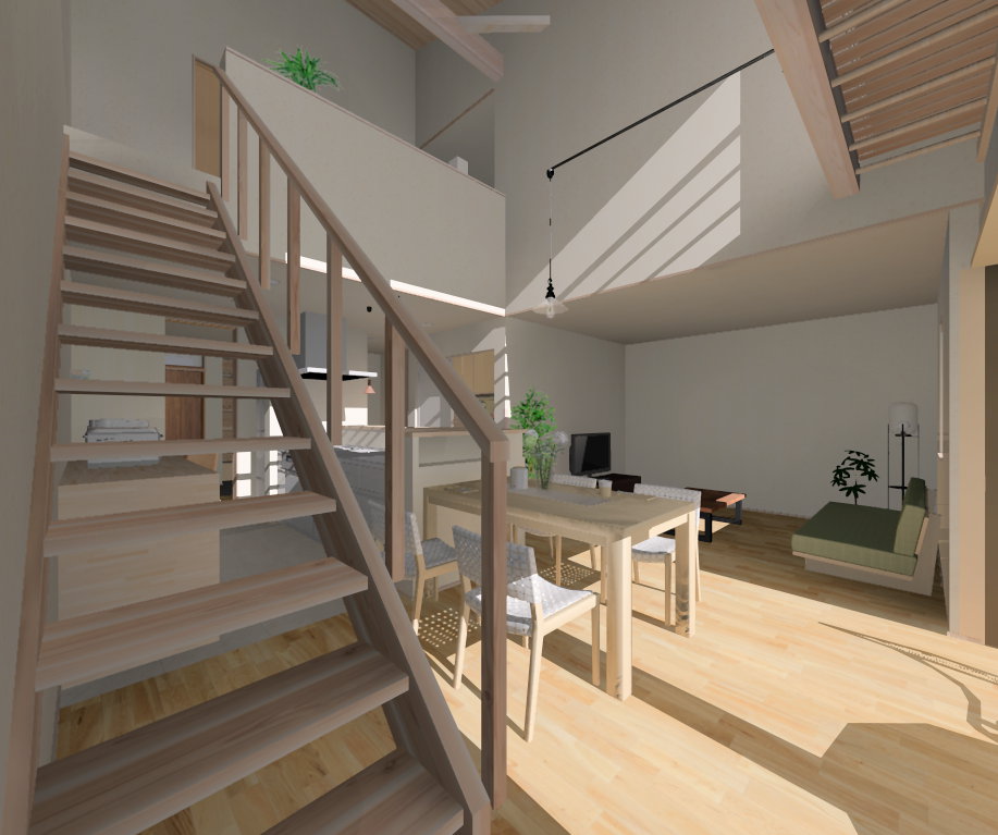 間取りは、シューズクローゼットやファミリークロークを設けて家事が楽で楽しくなる動線計画はもちろん、吹き抜けを設けて空間を豊かにしつつ、エアコン1台で家中を空調する計画になっています。
