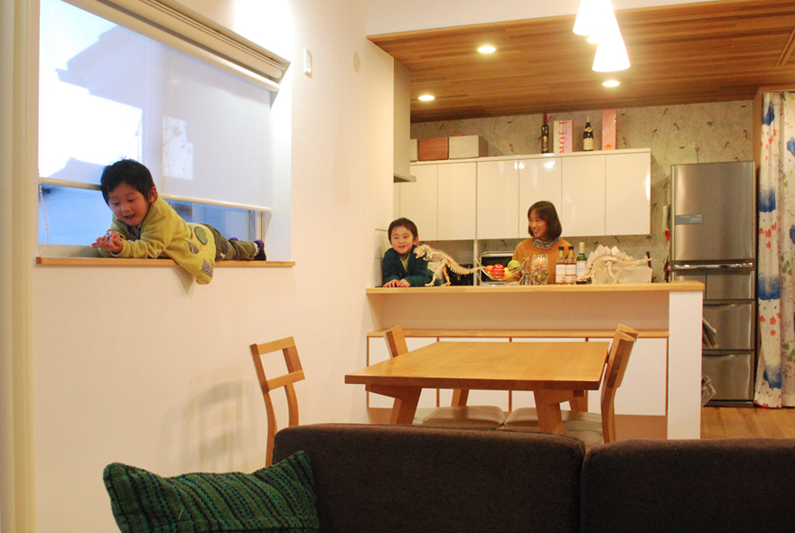 すべての施工が終わり、いよいよ完成の時!「養生をはがしてもらったときは、『わぁ!』と思わず歓声を上げてしまいました。自分たちの家ができたと、本当感動しましたね」。住み始めて2年、床や梁など木の色みが揃いだし、H様邸ならではの風合いが出てきました。「本当に大満足です。友人が遊びにくるとついつい自慢をして、なんだか説明会みたいになっちゃうことも(笑)。子どもたちも引っ越してきてからよりのびのびした気がします。成長するにつれてだんだん活発になってきていますしね」。お話を聞いている最中も、お子さまたちが楽しそうに駆けまわっていました!