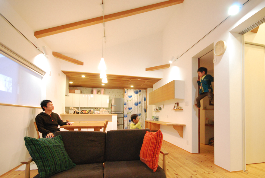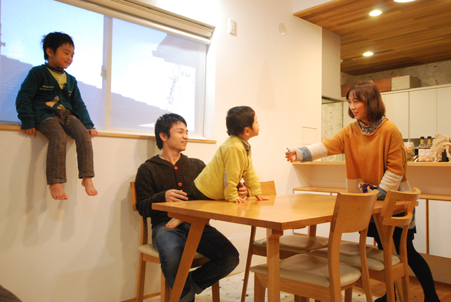 すべての施工が終わり、いよいよ完成の時!「養生をはがしてもらったときは、『わぁ!』と思わず歓声を上げてしまいました。自分たちの家ができたと、本当感動しましたね」。住み始めて2年、床や梁など木の色みが揃いだし、H様邸ならではの風合いが出てきました。「本当に大満足です。友人が遊びにくるとついつい自慢をして、なんだか説明会みたいになっちゃうことも(笑)。子どもたちも引っ越してきてからよりのびのびした気がします。成長するにつれてだんだん活発になってきていますしね」。お話を聞いている最中も、お子さまたちが楽しそうに駆けまわっていました!