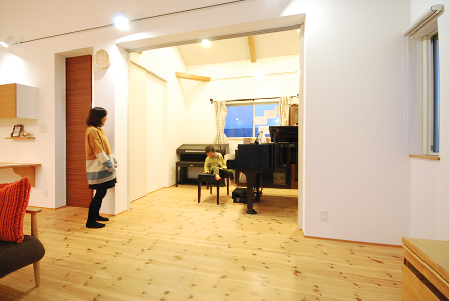 まずH様が大事にしたのは、音楽教室で使うリビングとピアノ室。リトミックという体を使ったレッスンも行うためなるべく広くスペースをとれるよう、扉で仕切るだけで出入りできる空間に仕上げました。「小さな子どもがピアノを弾けるようになるには家族が一緒に過ごすリビングにピアノがあったほうがいいと思うのです。ママが家事をしながら、子どもが弾けるようにって。だから別室にぽつんとあるのではなく、つながりが持てるような空間にしたかったんです」。とはいっても、音楽教室では生徒さんが家の中を通ることも。案内や張り紙はリビングには貼らずピアノ室だけに限定するなど、部屋を分けたことでご主人の居場所が守られるよううまく工夫されていました。そのほかにも、キッチンを広くとったことでそれぞれが作業しやすかったり、屋根裏収納を付けることで荷物整理がしやすかったりと、家族の希望が実際の暮らしやすさにきっちり反映されていました。