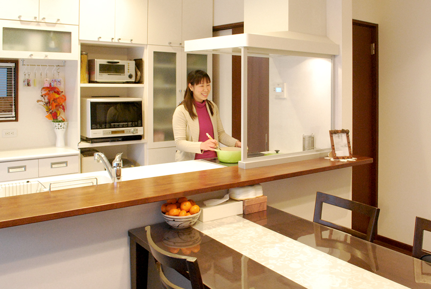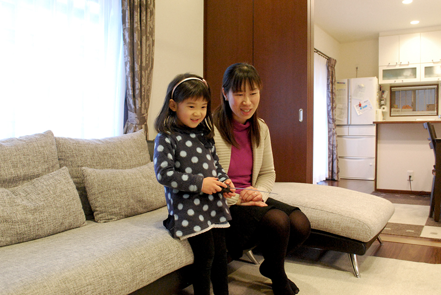 「家を建てるなら注文住宅がいい」と思っていたという奥様。大手ハウスメーカーだと土地が決まったら図面を決め、OKならば契約という流れが多いなか、ミノワでは決まりきった形のない自由設計です。「初めは少し戸惑った」そうですが、「自分で自分の家を作る楽しさがあった」とおっしゃっていただきました。「不安もありましたが、一から決めるのはとても楽しかったですね。パソコンで3D図面を作れるもので考えてみたり、方眼紙に書き込んだり。考え出したら止まらなくて、図面を7パターンも書いてもらいました(笑)。最終的に、最初と最後に考えたものが今の家に一番近くて。たくさん考えた分、とても満足していますね」。より具体的に想像できるようにと、完成見学会だけでなくOB宅の訪問や現場監督の家なども積極的に足を運んでくれました。
