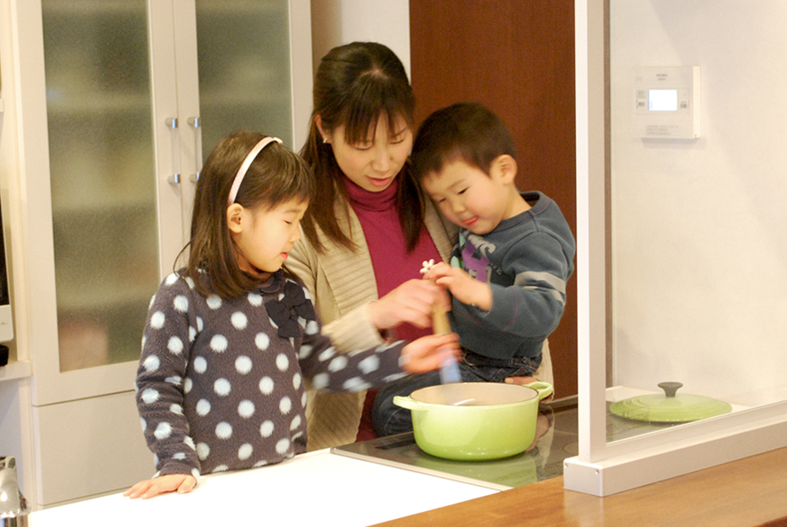 当時の住まいから車で10分ほどの家に住んでいたO様ご家族は、現場にも度々足を運んでくれました。キッチンの置き場所や、キッチンと食器棚の幅など、図面では分からないことを現場で細かく打ち合わせ。実際に立ってもらい、メジャーで図りながら決めていきました。「建てながら考えられるというのは、ミノワさんの特徴です。おかげで、モノの配置や壁紙など実際に見ながら考えることができたので、住んでからも違和感がまったくないです」と奥さま。2階の寝室は家族全員で寝やすいように畳に、そして現在たくさんおもちゃがある子ども部屋は14畳と広めにし、将来仕切りを作れるよう配慮しました。「大工さんがとても丁寧な仕事をしてくれました。4枚分の開口の引き戸があるんですけれど、建具屋さんでは既成品がないので作ってもらいました。出来上がった時は感動しましたね。そして『ここをこうしてほしい』ということがあった時は現場監督さんに伝えるだけで、すごくスピーディに対応してくれたので助かりました」。