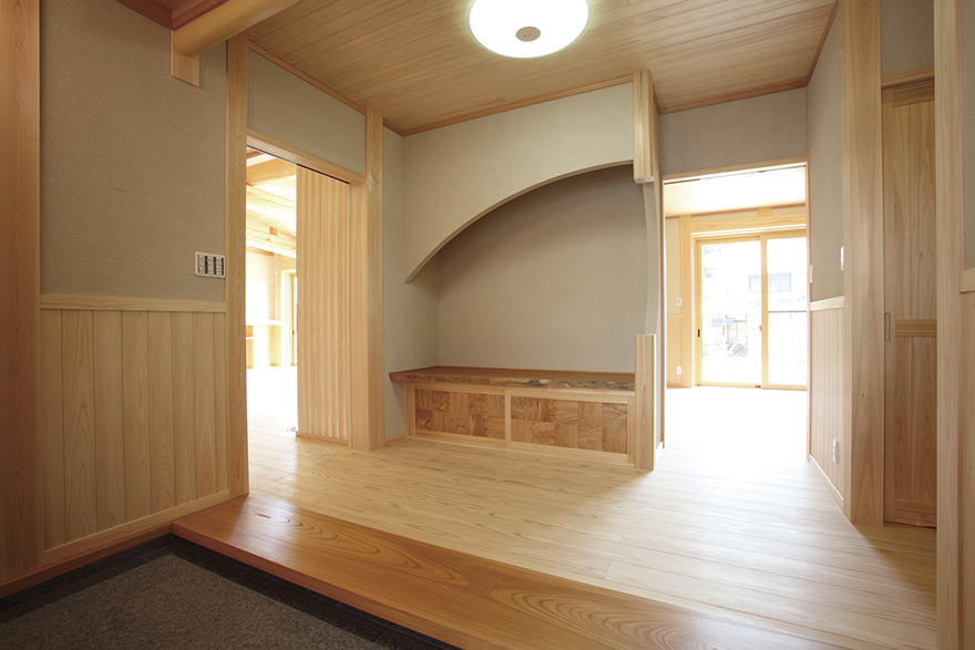 伝統的な土壁工法に、内外の二重断熱を組み合わせることで、一年通してエアコン使用が数回ですむほど気密性の高いG様邸。「冬はエアコンを数時間つけるだけで室内を18℃前後に保てます。夏も外から帰った時にムッとした不快さがなく爽やかです」との話。高い断熱性能と合わせて、日差しが入る角度や季節ごとの風の通りを考え、太陽熱や夏の涼しい風を生かせるよう設計されたパッシブ住宅でもある。床には杉板を張り、天井・腰板・建具には桧材を使用。建具など造作一つひとつに、大工職人の細やかな仕事ぶりが見られる木の香りに満ちた住まいだ。