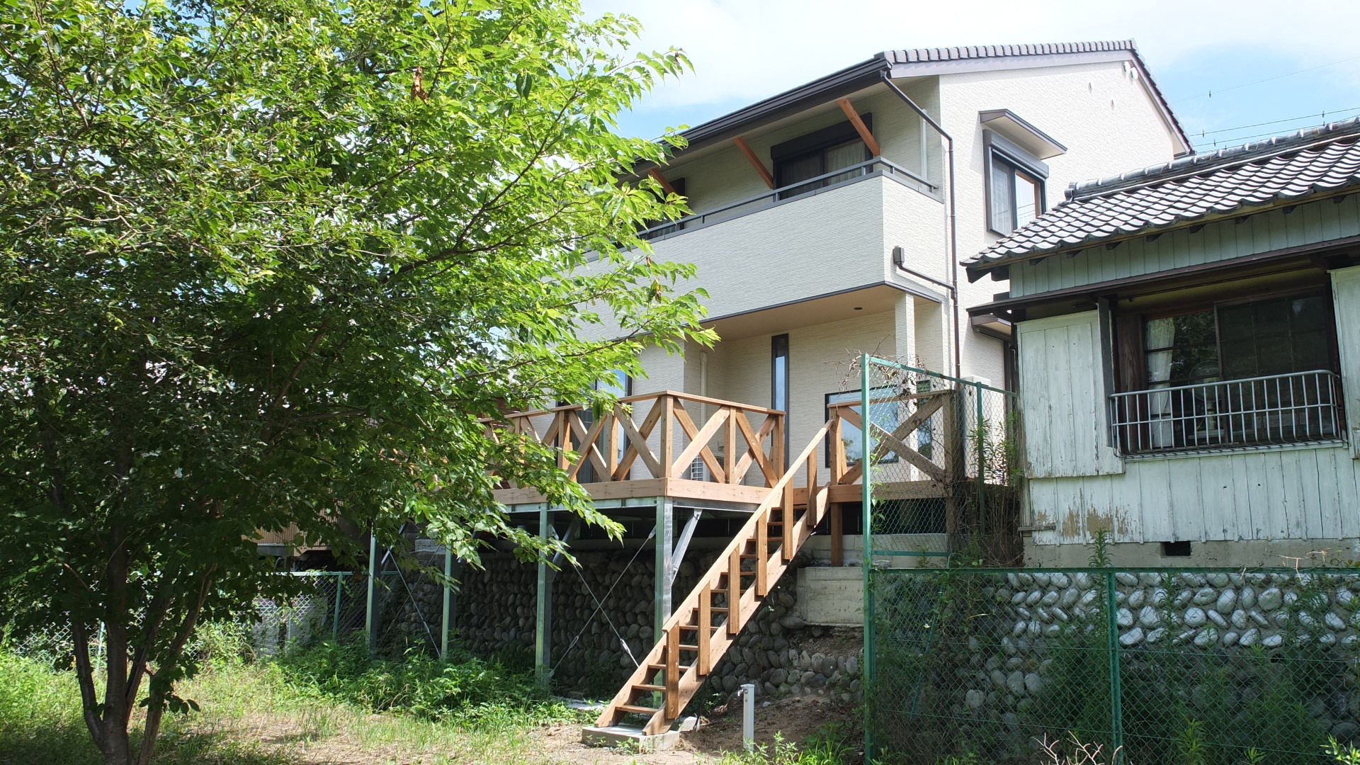 ゆったりと流れる川を臨む大きなウッドデッキと槙の風呂
