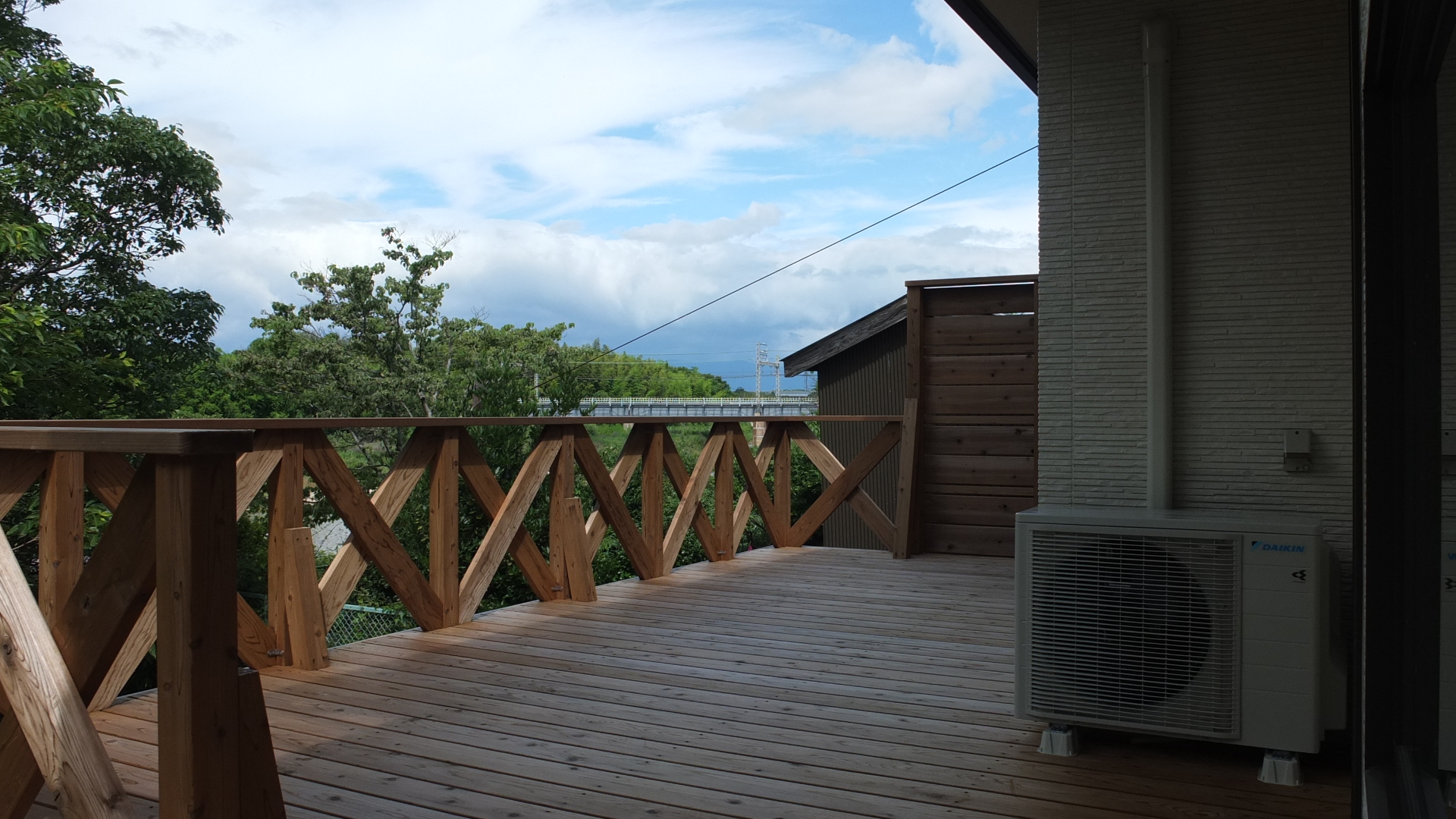 ゆったりと流れる川を臨む大きなウッドデッキと槙の風呂