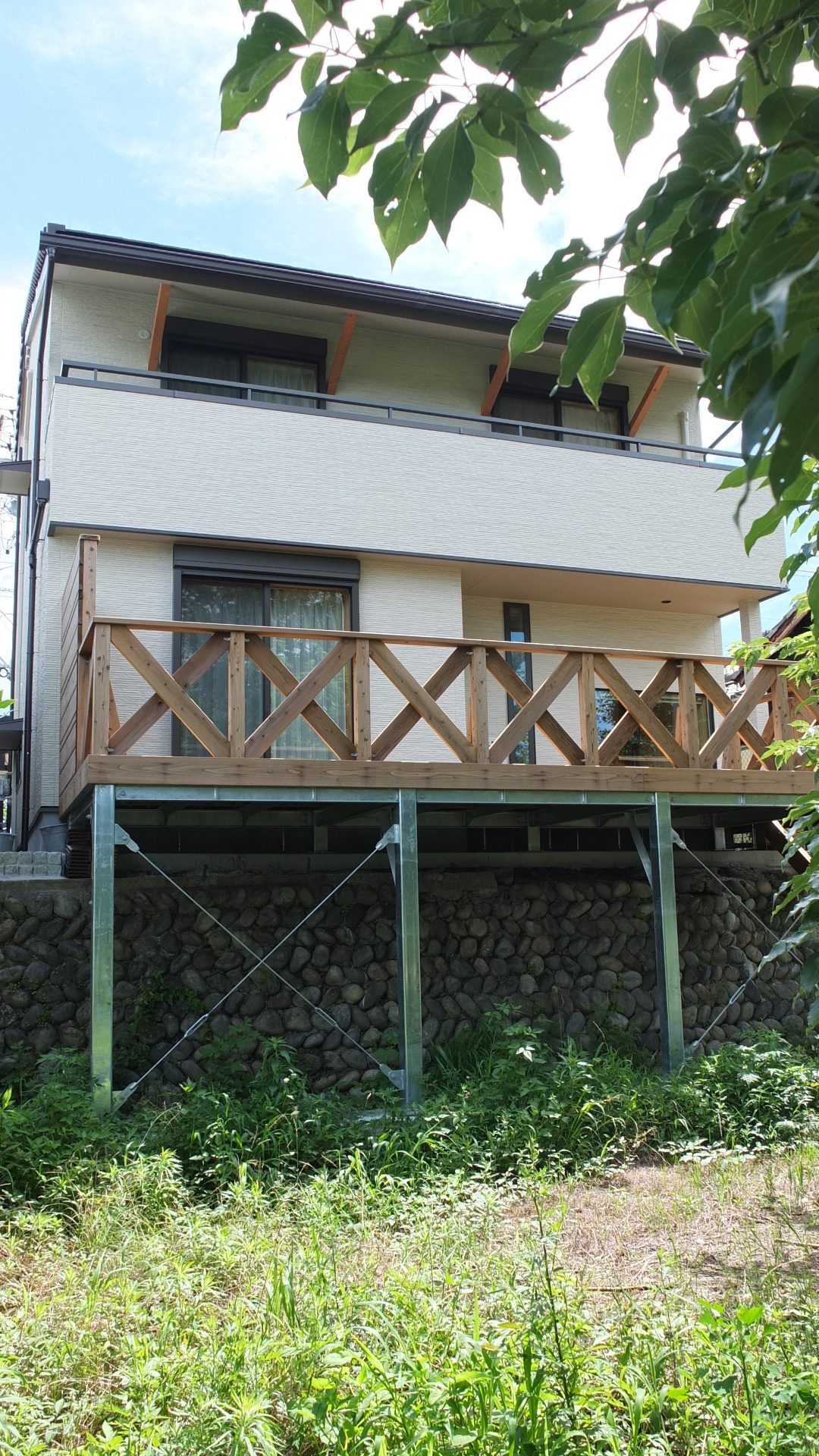 街の中を流れる川の堤防の上という立地から、南側には滔々と流れる川の流れ、河川敷の自然、川にかかる鉄道の鉄橋を眺める事ができます。河川敷に向かって持ち出した大きなウッドデッキや一段下りた広場では川の景色を眺めながら休日にはのんびりと過ごす事ができます。同じく南面に配置された浴室には木の香り漂う高野槙の浴槽を据え、室内の内装を桧張りとしています。お仕事で疲れて帰ってきた時は浴槽に身を沈めn様の好きな鉄道を眺めながらゆっくりとした時間を満喫できる事でしょう。