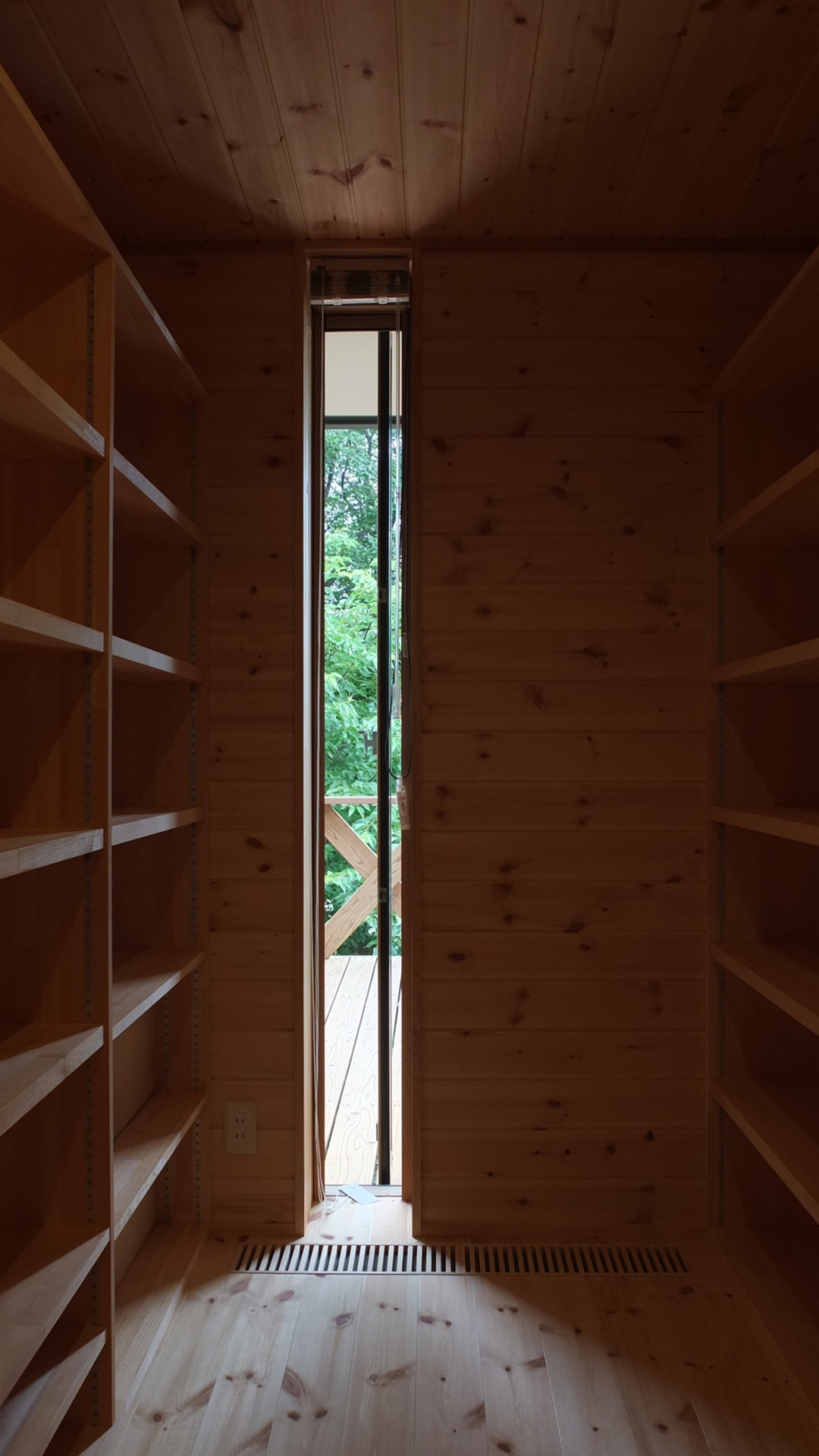 お仕事柄、大量の書籍や資料をお持ちのn様ですが、ご希望はそれらの書籍を保管しておく書庫が欲しいとの事でした。プランニングにあたり、行き止まりの納戸のような書庫に仕舞いっぱなしにさせることなく、書籍も一つのインテリアとみなして住宅を貫く廊下を兼用させ、住宅の中に開架書庫をつくる、という配置としました。これからも増え続ける書籍を収納するため、廊下だけでなく吹抜の手摺を兼ねた本棚など、住宅のあちこちに収蔵できるようにしています。