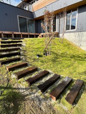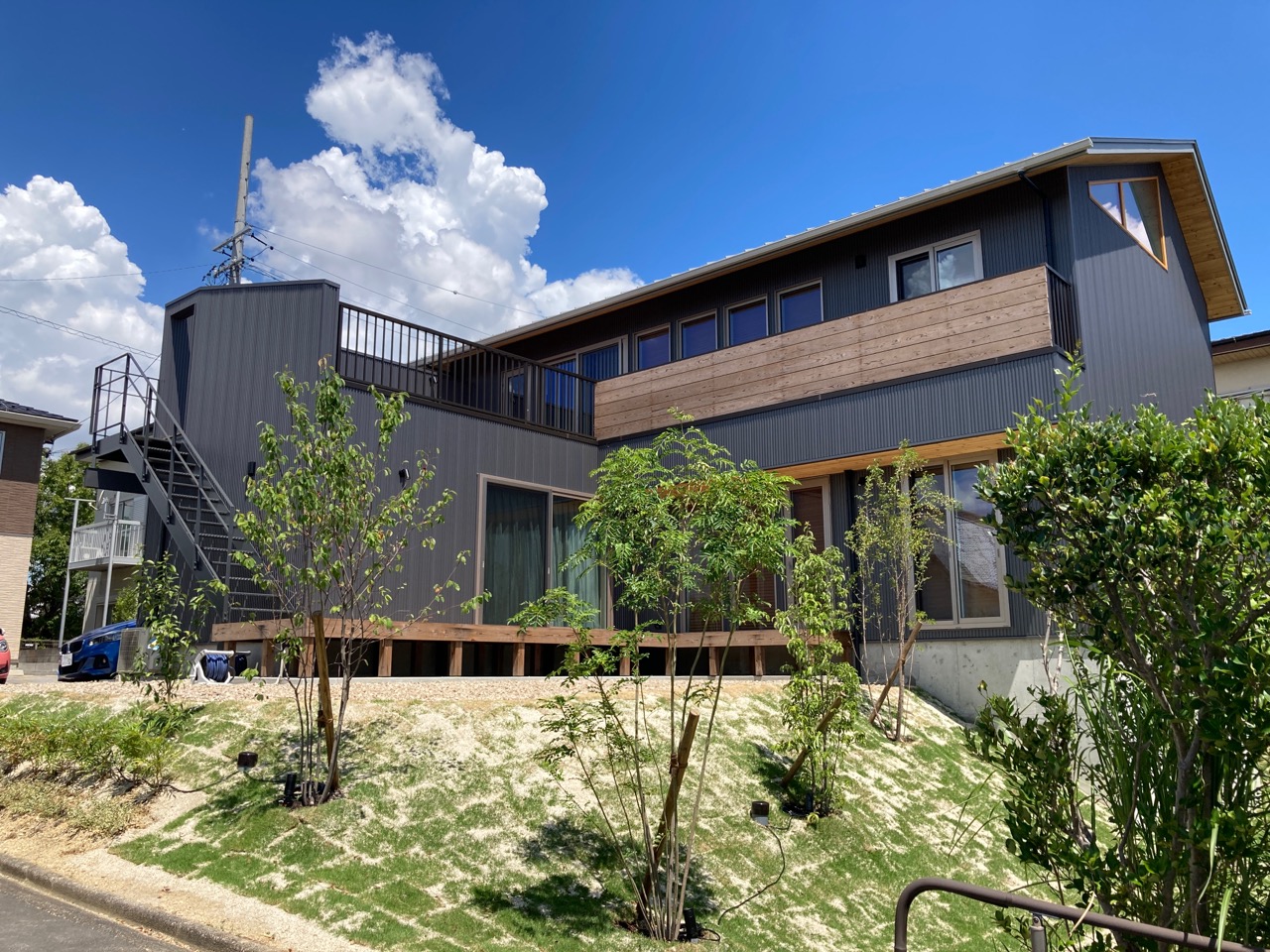 計画地は名古屋市条例の緑化地域や風致地区に該当するため、敷地面積の30%を緑化する必要があり、駐車場、庭の一部を除いた部分は一面の緑。傾斜地に建築しているため庭の半分以上が芝生の斜面になっています。幼い兄弟がもう少し大きくなったら段ボールで滑る恰好の遊び場所になっているところが想像できます。