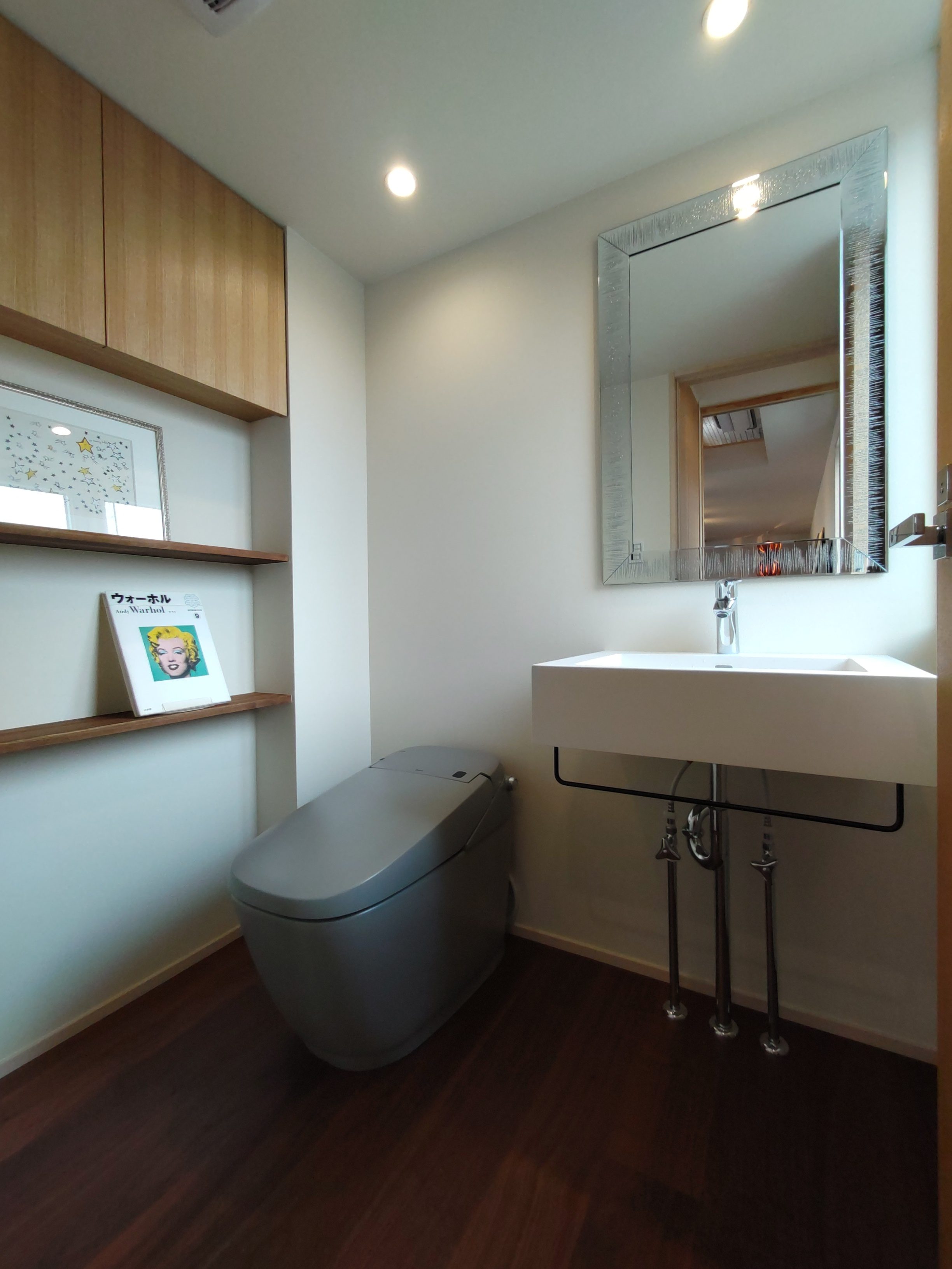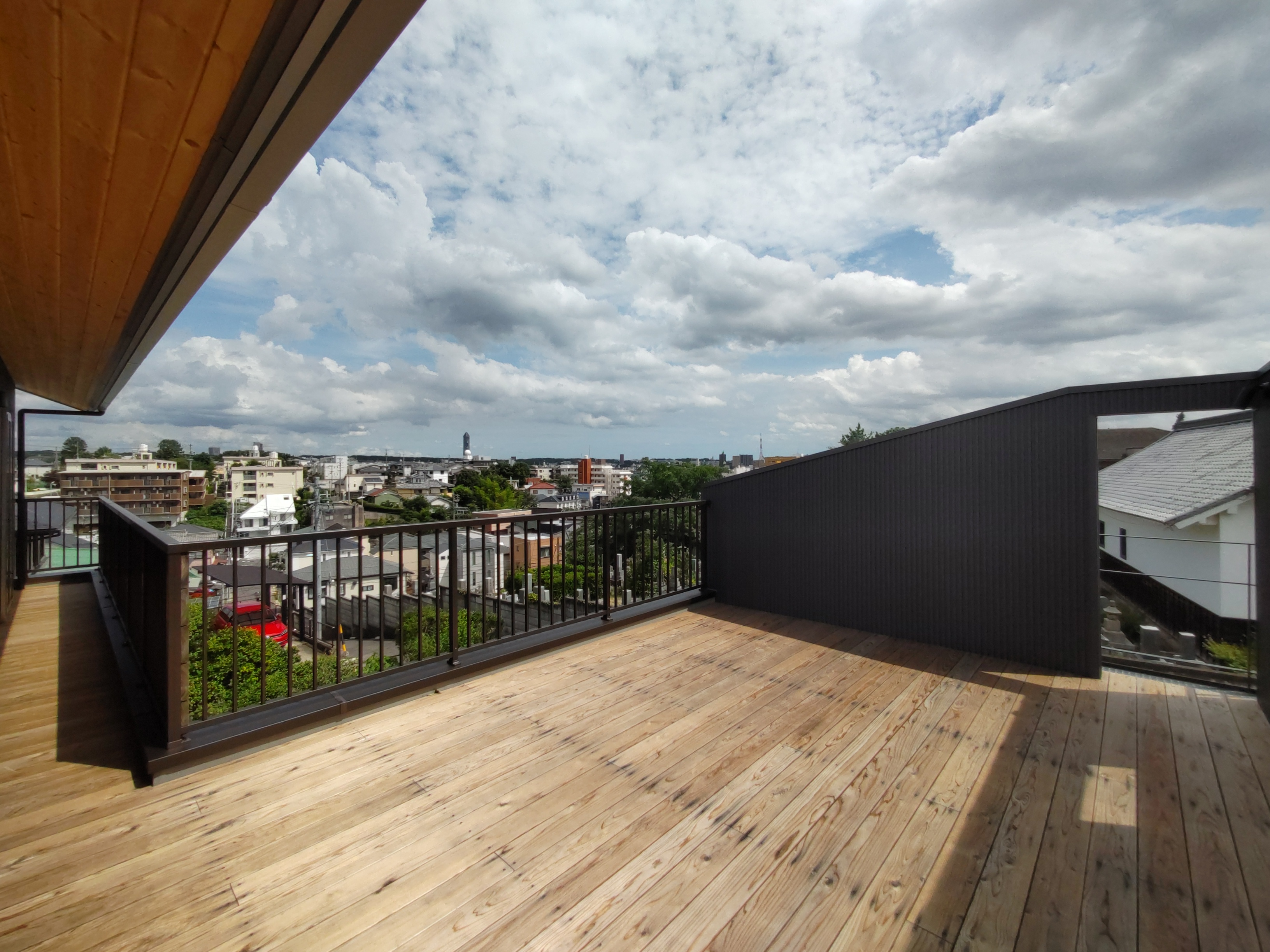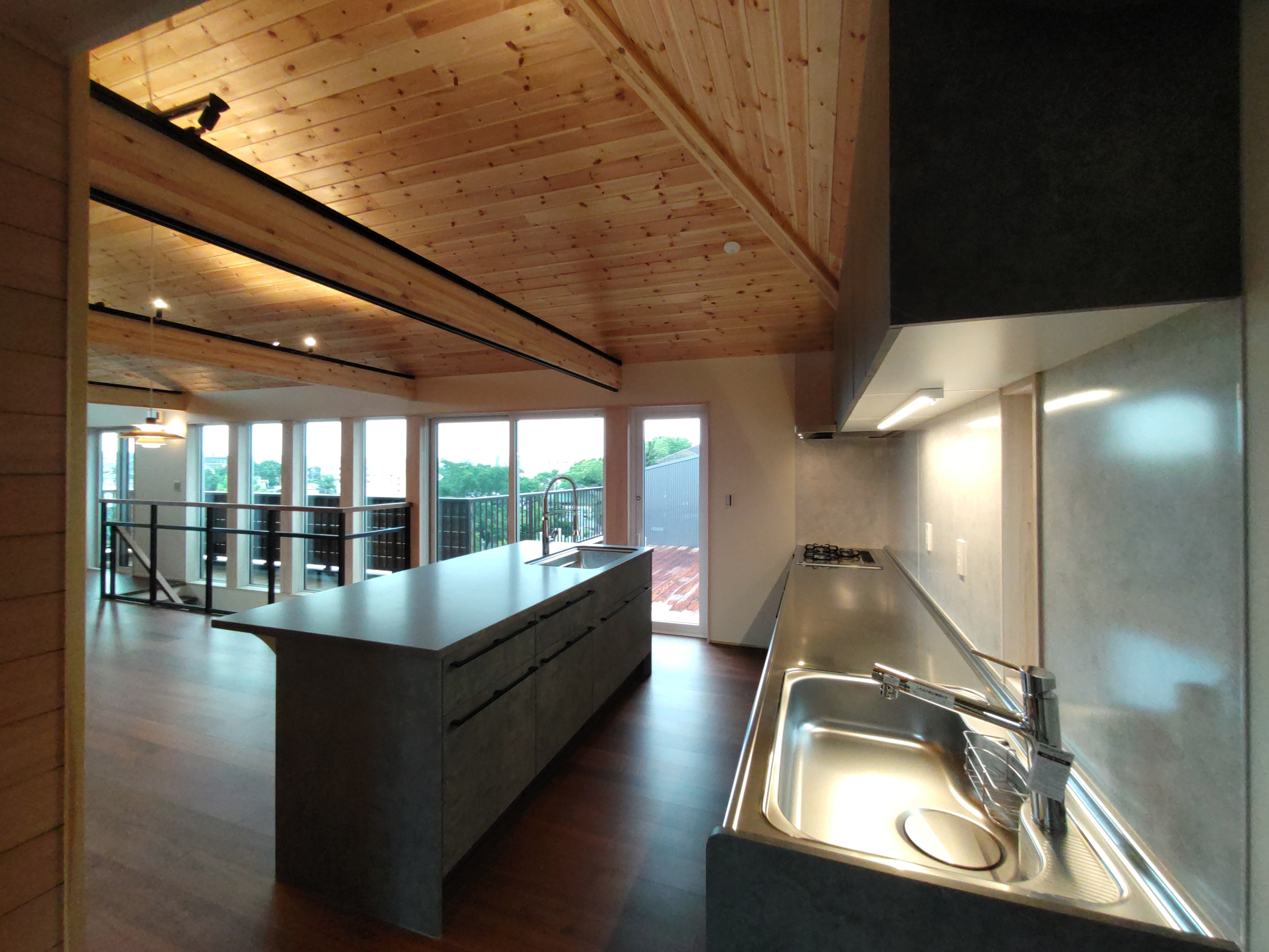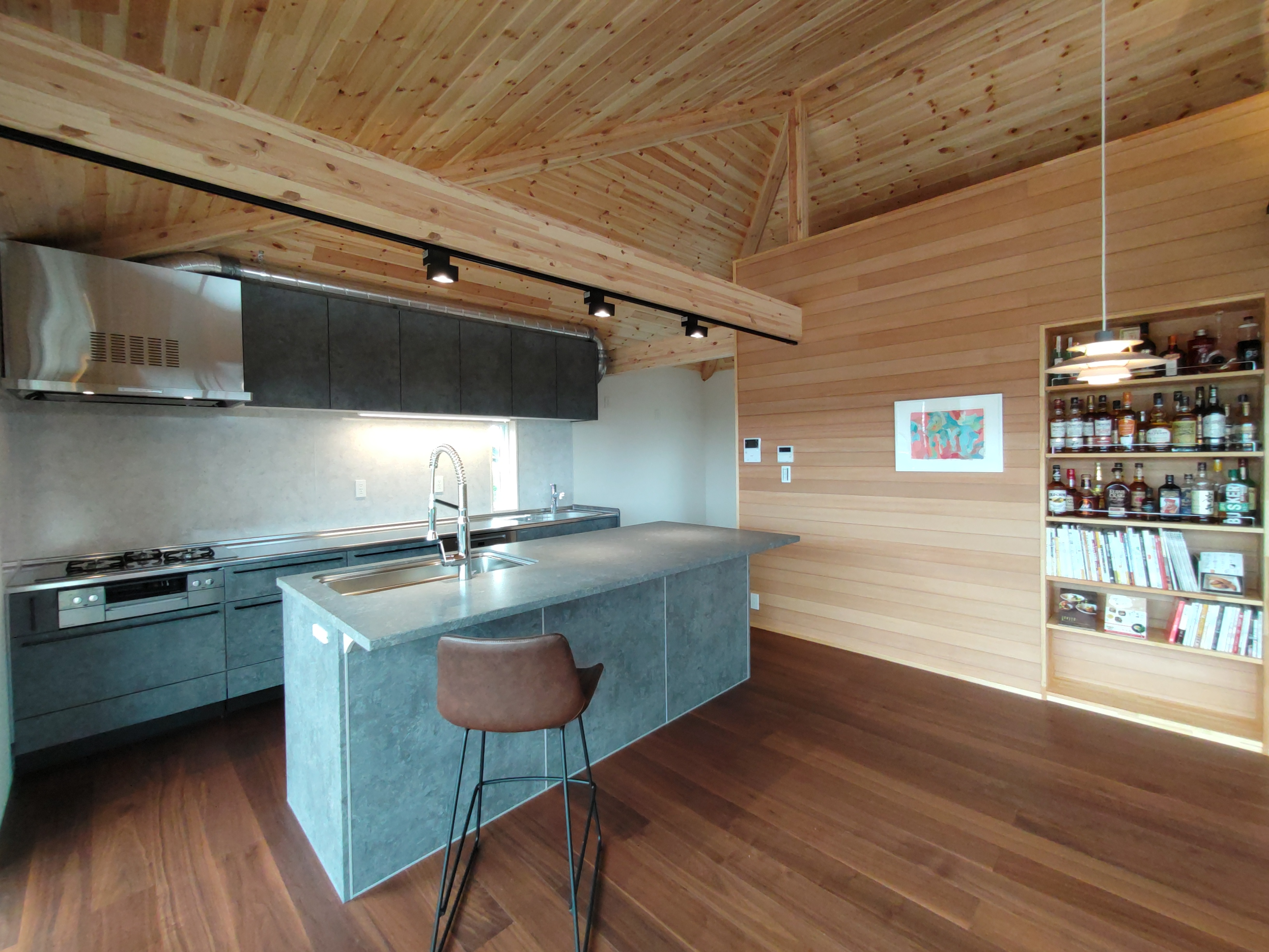 今回の住宅設計担当はs様が東京に勤務されていた時のお知り合いの設計事務所の方。敷地の特性を読み解き、眺望の良さを十二分に活かすため、また、大人数を招き食事会を催すのが大好きなs様のために大スペースを確保するべく、2階にLDKを配置する間取りとしました。LDKはアイランドキッチンと壁付けキッチンの二列型とし、東側に勾配天井を持つ大ボリュームのリビングダイニングが広がり、南側にはセカンドリビングとして屋外に約12帖大のバルコニーが続きます。そのいずれの場所からも眼下に広がる東山の景色を眺められる配置計画。普段は生活の場として使われるLDKと子供の遊び場として使われるバルコニーはアイランドキッチンを中心として10~20人前後を招いても十分なパーティースペースに様相を変えます。