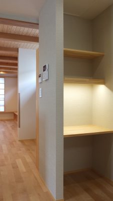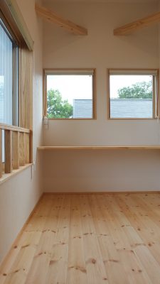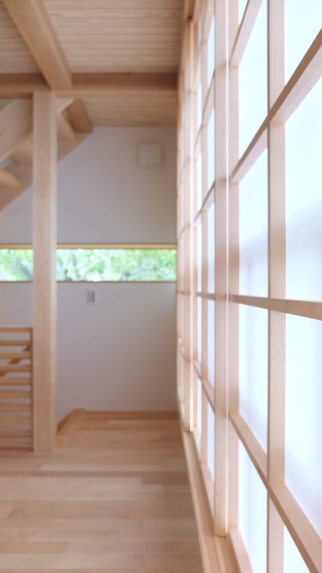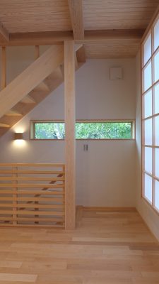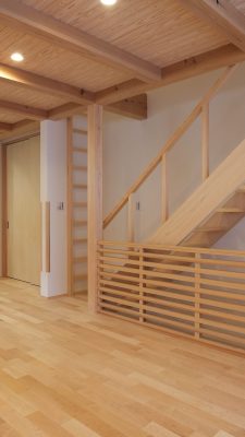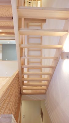 1年半ほど前に開催された完成見学会(『INandOUT』稲沢市mi様邸)に当時はまだ計画をスタートされたばかりのyoyo様がご来場されました。mi様邸には小さいお子さんが喜んで遊べる仕掛けがあちらこちらに、yoyo様の一人娘ERIちゃんも目を輝かせて体感していました。特にリビングから2階へと掛かるハシゴがお気に入りの様子で、ひとしきり見学を終えた後に『うちにもハシゴが欲しい』と。そんな話を聞いてしまった以上はこの筆者、『必ずつくってみせる!』と息巻いて計画に取り組みました。様々な制限を加味しながらプランを進め、リビングからERIちゃんの部屋へと続く『ヒミツの通路』としてのハシゴが完成しました。(実は『ヒミツの通路』とする事にも『準防火地域の三階建て』と『高度地区』の制限が少々関係してくるのです。)
