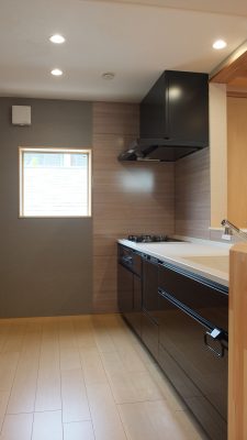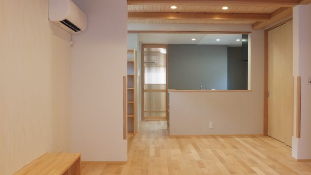 結果、コンパクトながらLDKは木表しのインテリアで広がりを感じられ、外部に対して閉じたいところは閉じ開きたいところは開く、ご近隣の樹木等の借景にも恵まれ、非常に印象的な空間となりました。