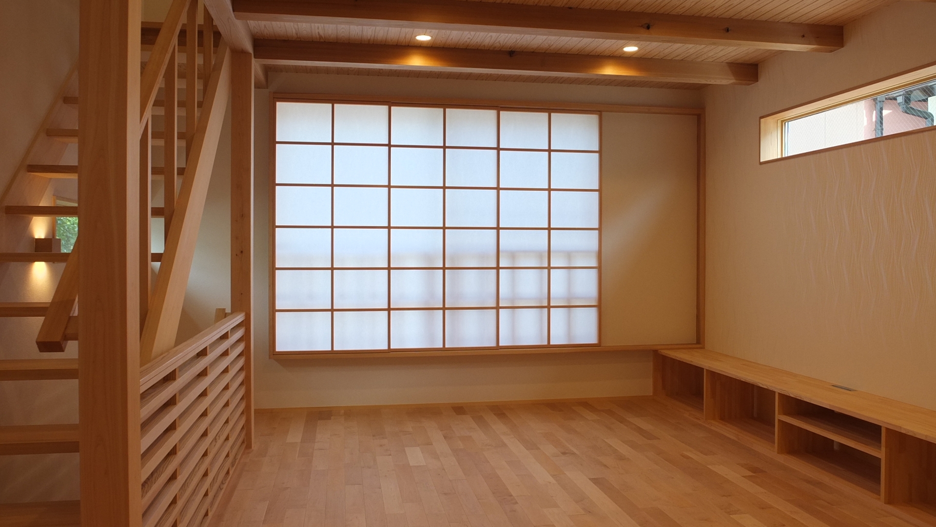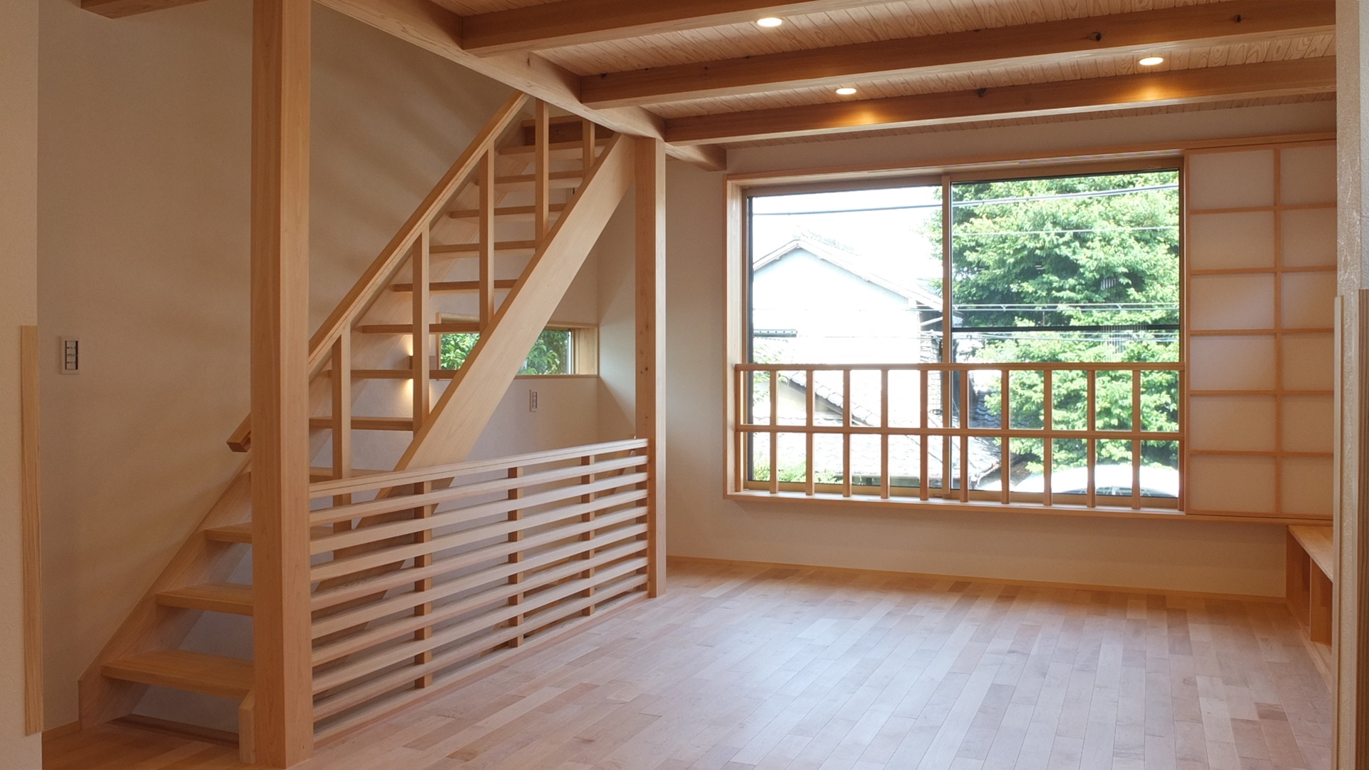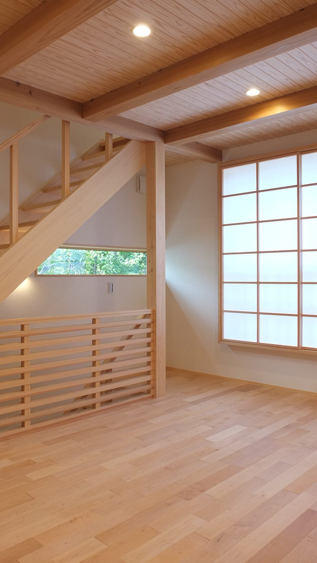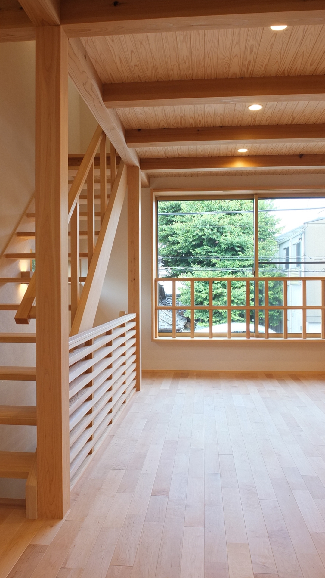 昨年のk保木棟梁に続き若手大工h谷川君が親方の元を離れて一人で担当した記念すべき住宅です。(狭小地で作業車の駐車スペースも限られるため、ハイ●ースに乗っている棟梁が多い中で唯一軽バンに乗っているh谷川君にお願いした、というのが真相ですが)先輩のk保木棟梁も手伝いに来てくれましたが、二人ともさすがは親方の元で厳しい修行をしてきただけあって、各所の収まりも非常にキレイでした。特に階段の手摺の造作は、どこからビスを打って固定しているのかが分からないような見事な加工。親方のk棟梁が『ずっと棟梁として飯を喰っていけるように』とh谷川君の腕に仕込んだ技術が早くも活かされた事例となりました。