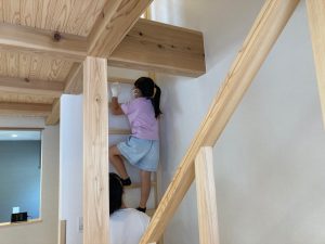 完成見学会にやってきたERIちゃんにさっそく上ってもらい、他のご来場者にもお手本を見せてもらいました。『早く引っ越して友達を呼んで遊びたい』と、喜んでもらえて頑張ってつくった甲斐があったというものです。