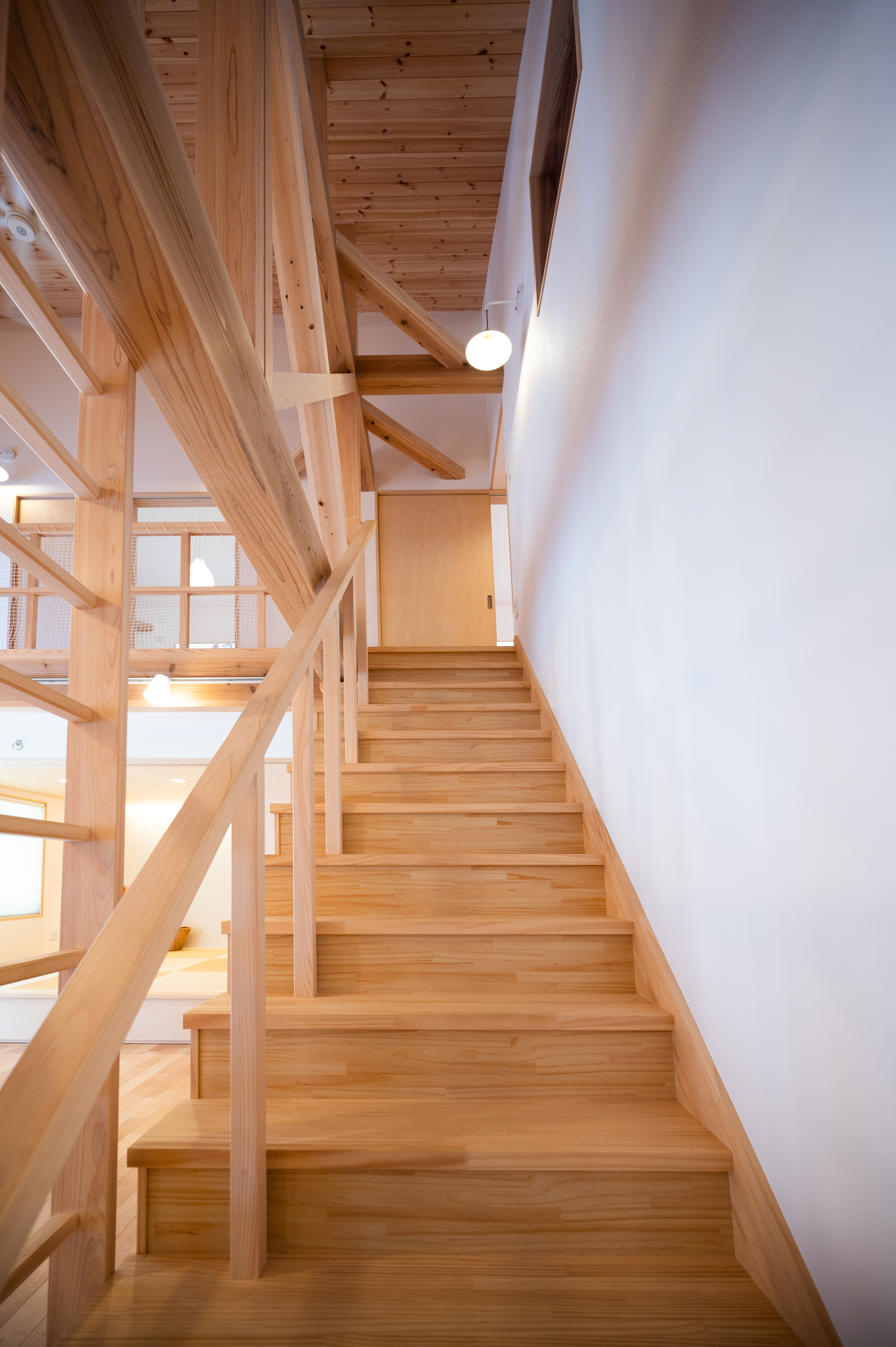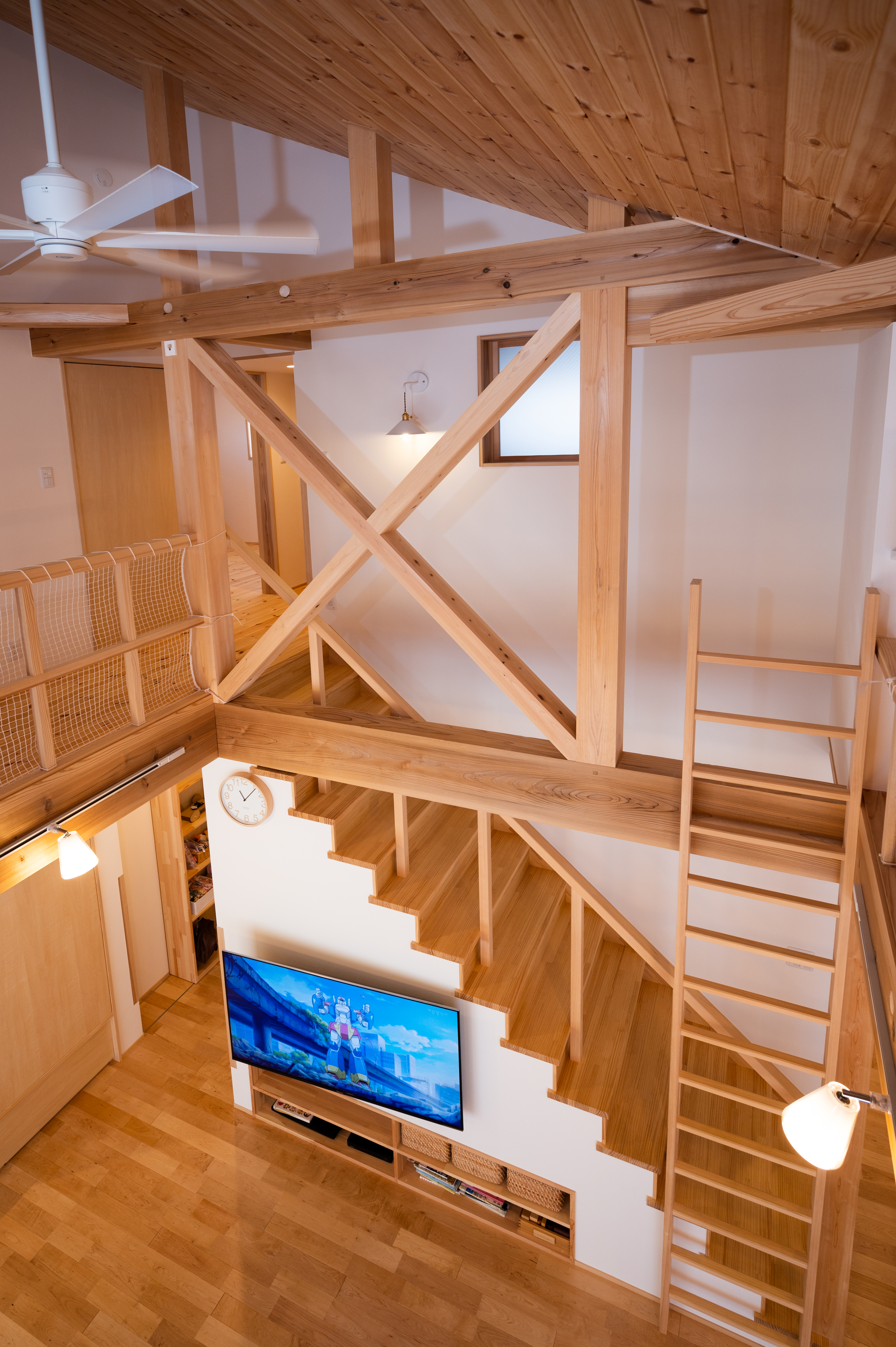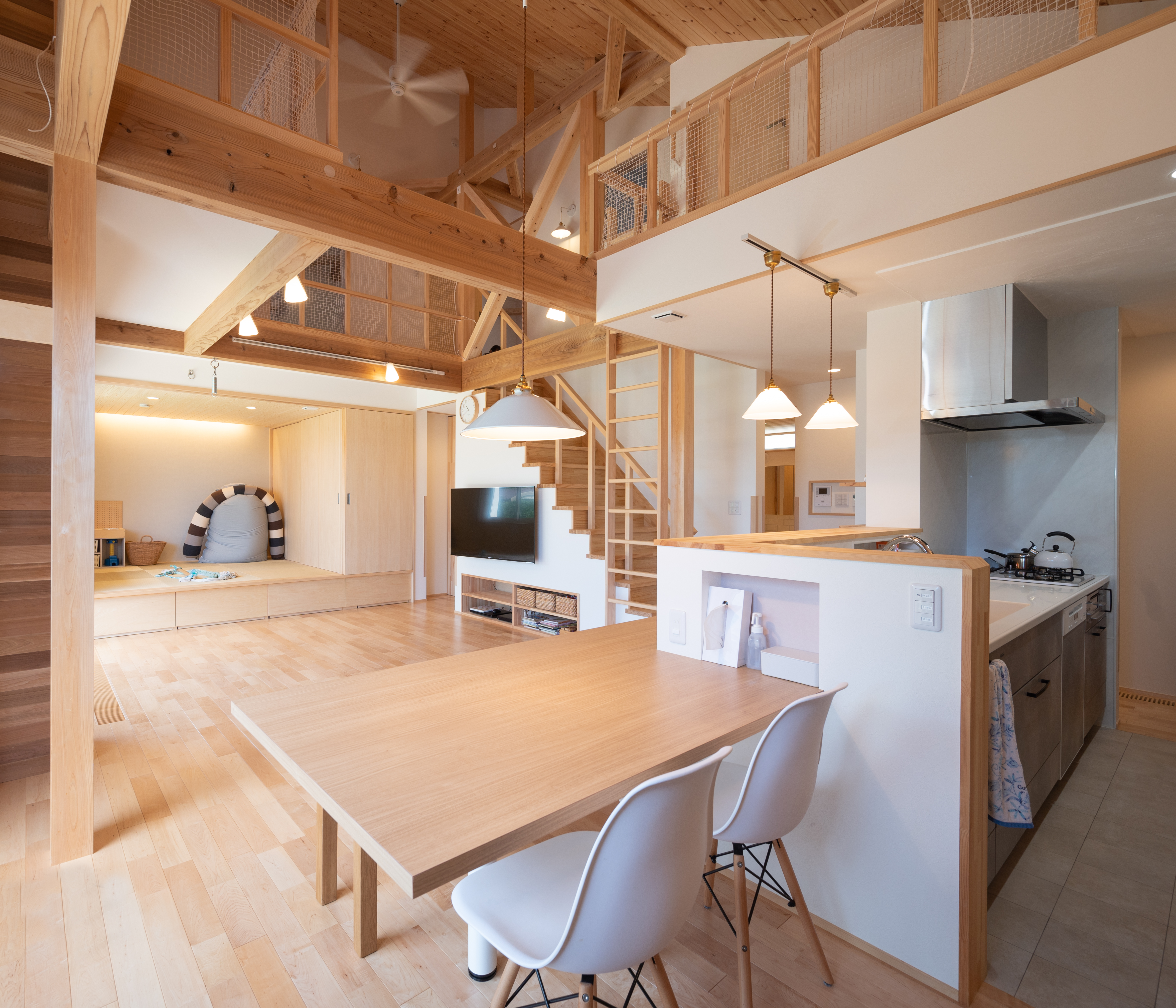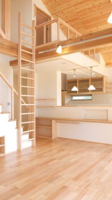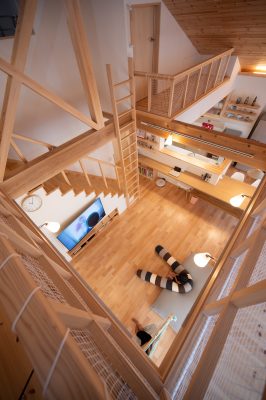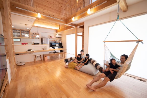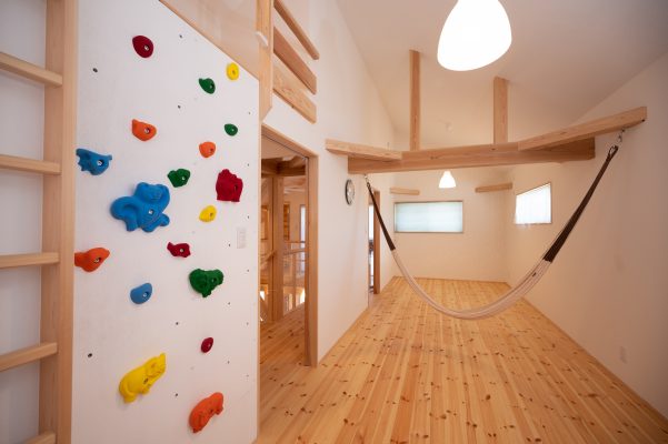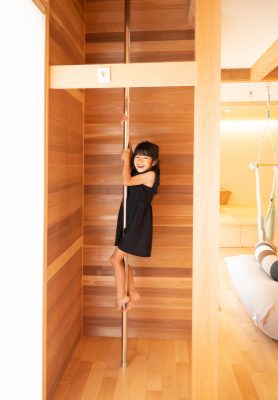 『外に行かなくても中でも遊べるね』 出来上がりを内見した奥様が幼い三姉妹に語った感想がすべてを物語ります。大通りから少し路地を入っているため、庭でも安心して遊べる広さのmi様邸ですが、ご主人は住宅の内なる生活空間に遊び心を取り入れる事に徹底してこだわりました。上り棒、ボルダリング、ロフト、ハンモック、小さな子供が目を輝かせて住宅内を駆け回れる仕掛けが満載です。きっとご主人もお子様の嬉しそうな顔を見たくて『早く帰ってきたい』と思うような家ができた、と実感されていると思います。