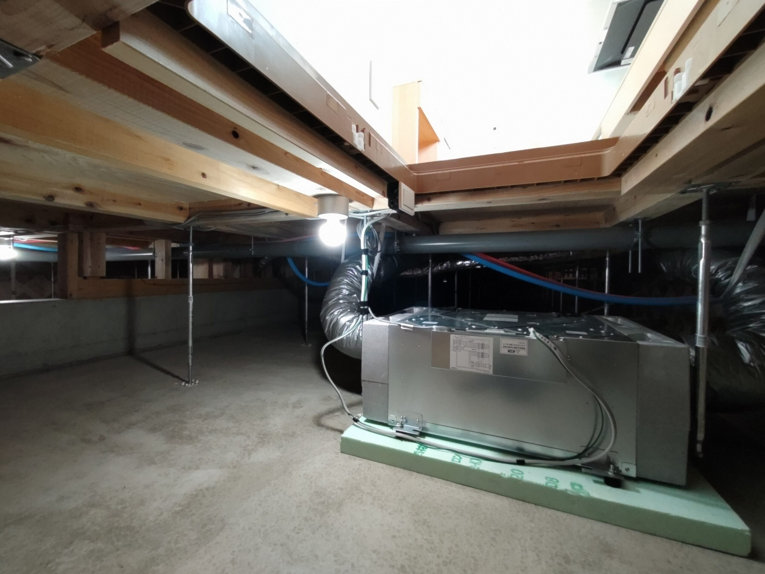 [断熱]基礎内:高性能フェノールフォーム80㎜ 外壁内:高性能グラスウール105㎜ 外壁外:高性能グラスウール105㎜ 屋根:高性能吹込みグラスウール300㎜