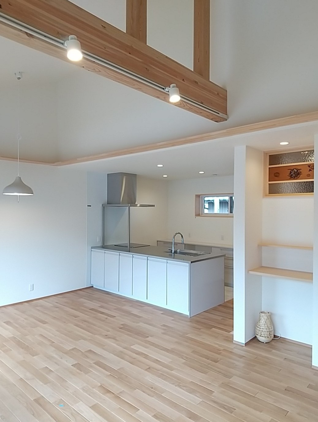 【延床面積】94.80㎡(28.68坪)/【工法】木造軸組工法/【断熱】基礎内:押出法ポリスチレンフォーム 外壁:高性能グラスウール+付加断熱高性能グラスウール 屋根:高性能グラスウール/【換気】第1種換気(熱交換換気扇)【屋根・外壁】屋根:平板瓦 外壁:弾性リシン吹付仕上げ【開口部】樹脂サッシ【内装】床:ナラ材 壁:クロス 天井:クロス、杉材/【UA値】0.33【ηA値】1.4【C値】0.7