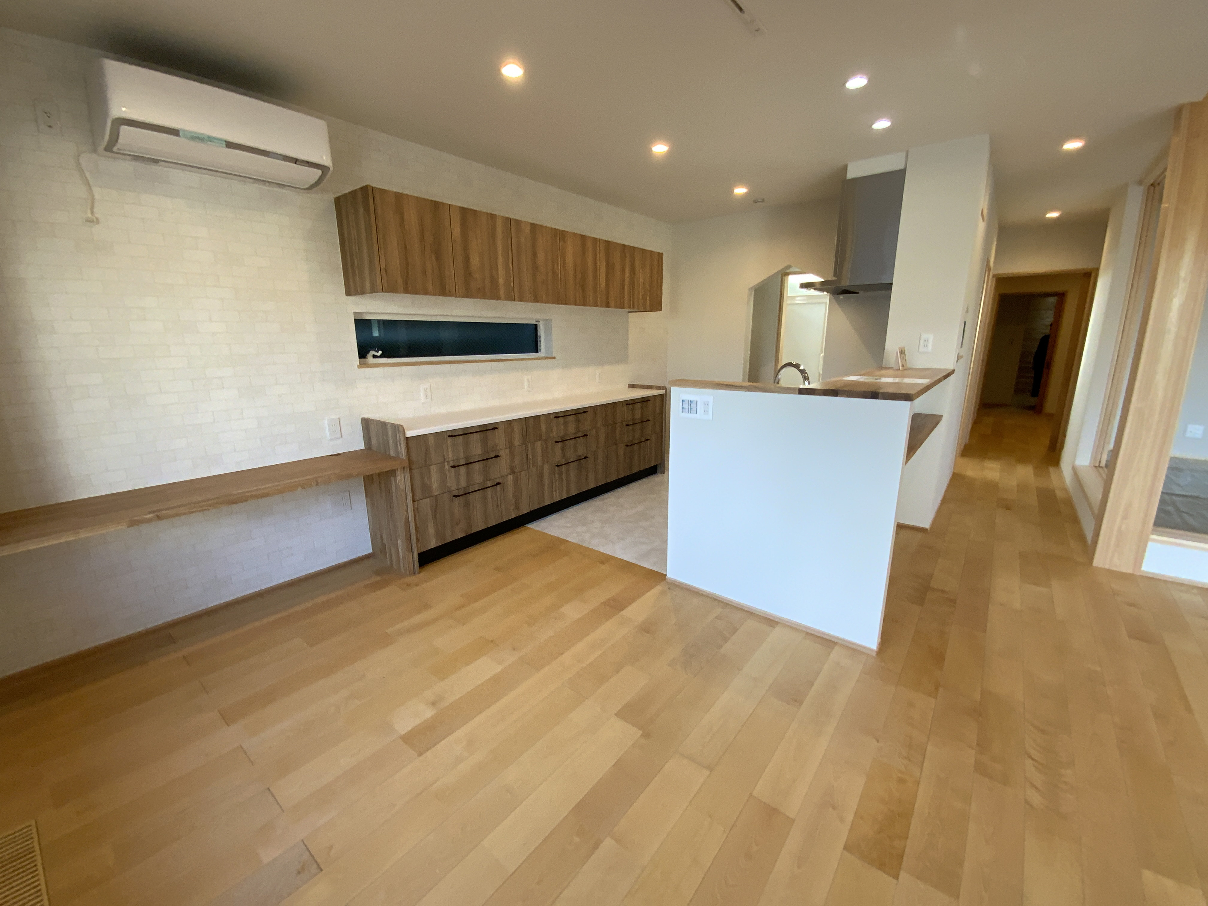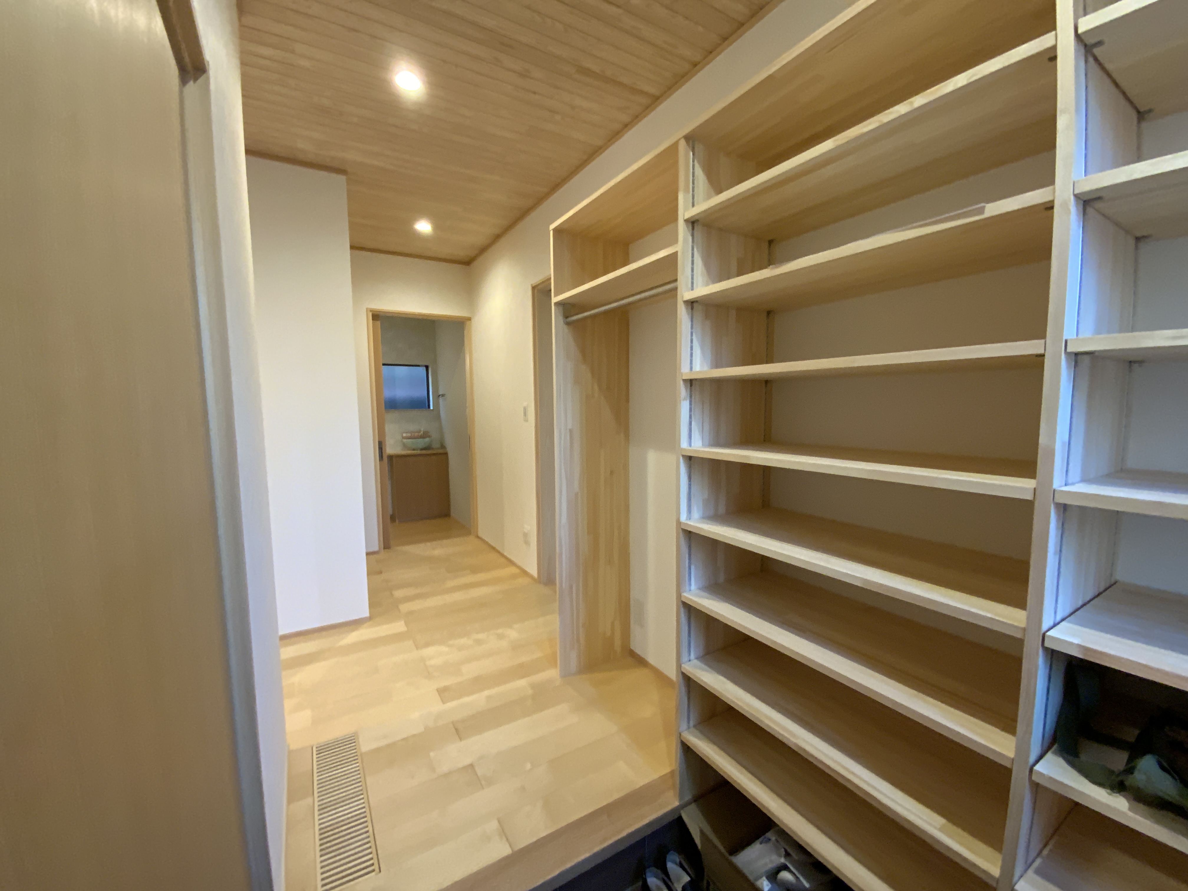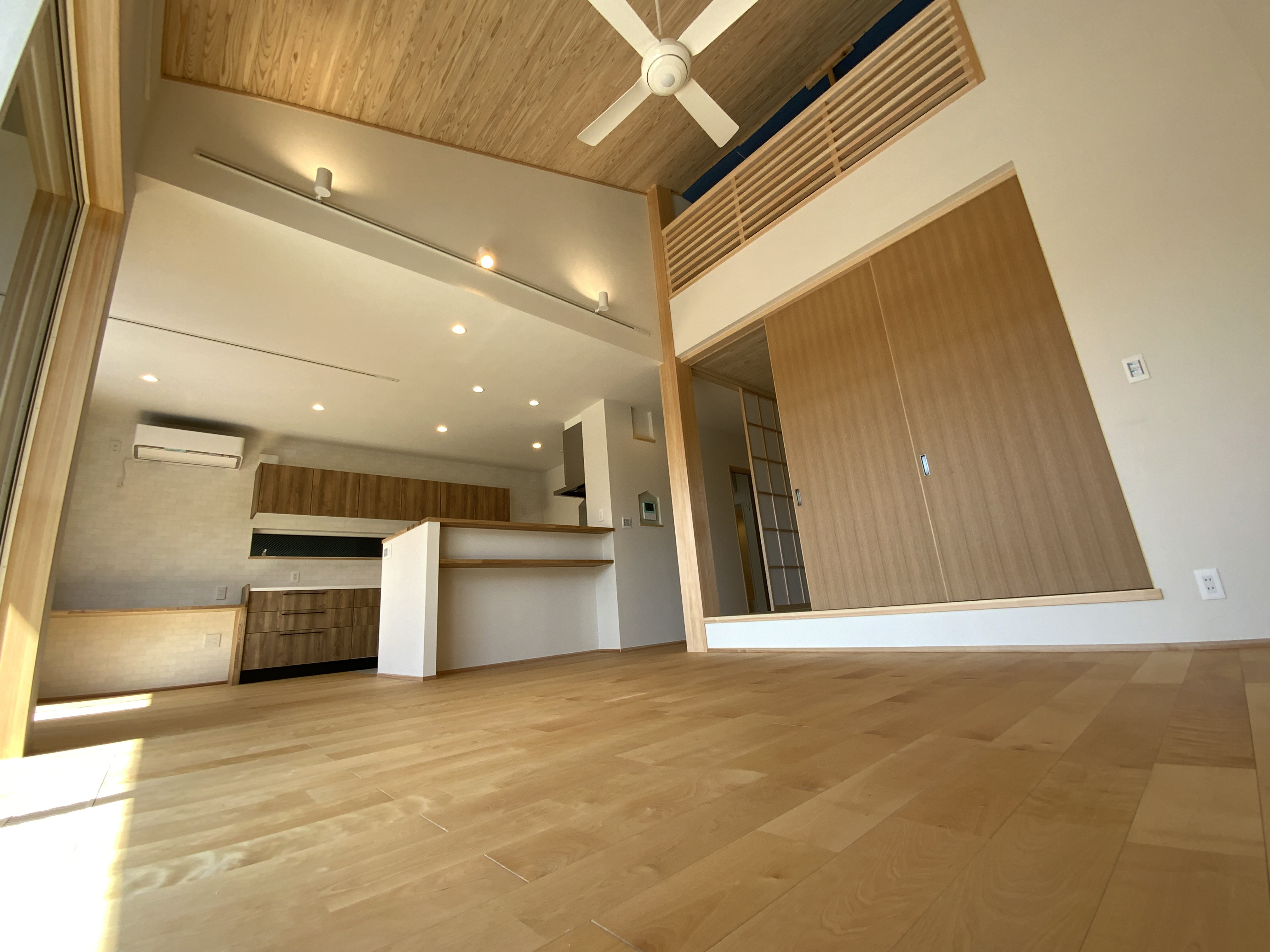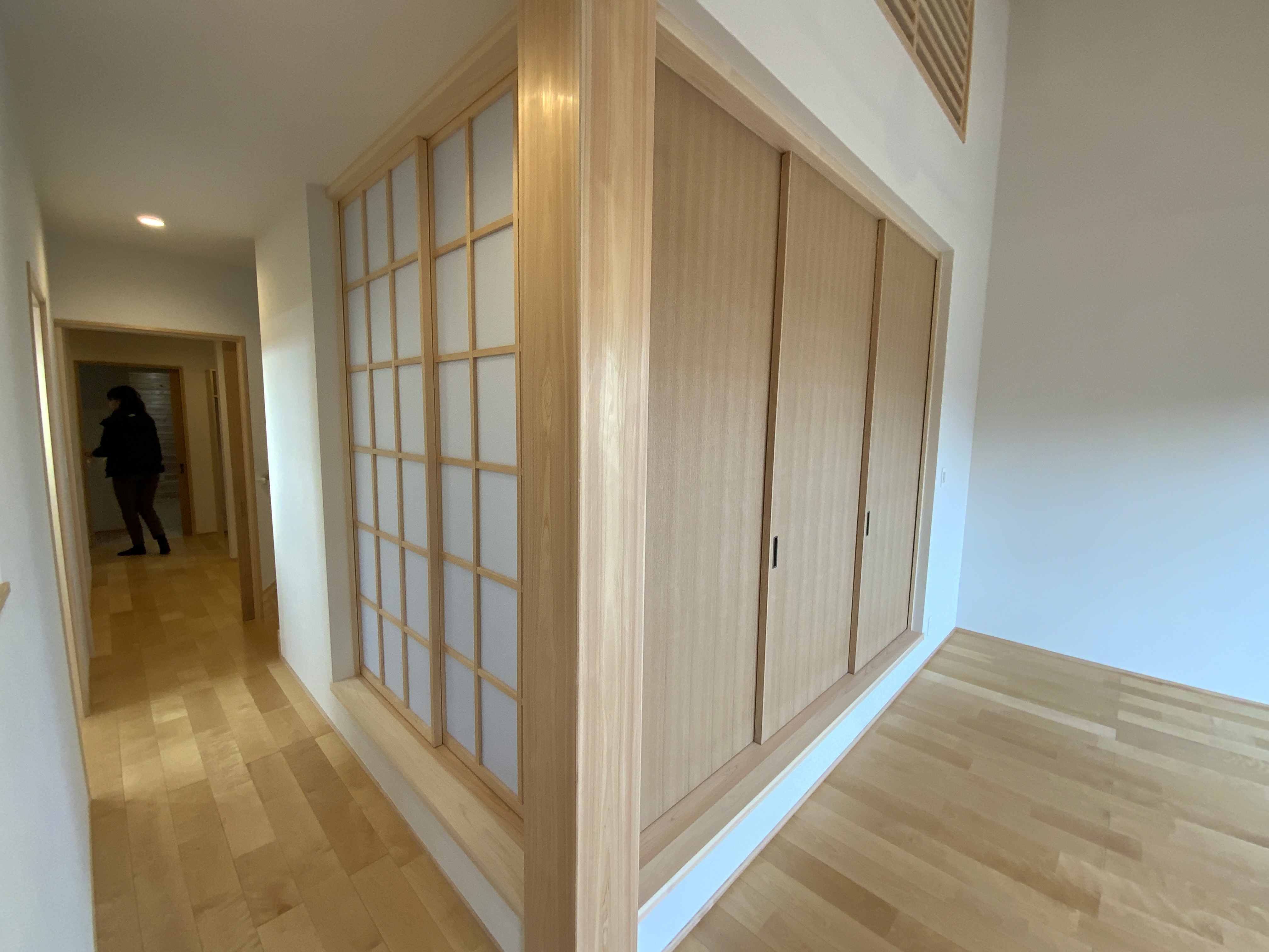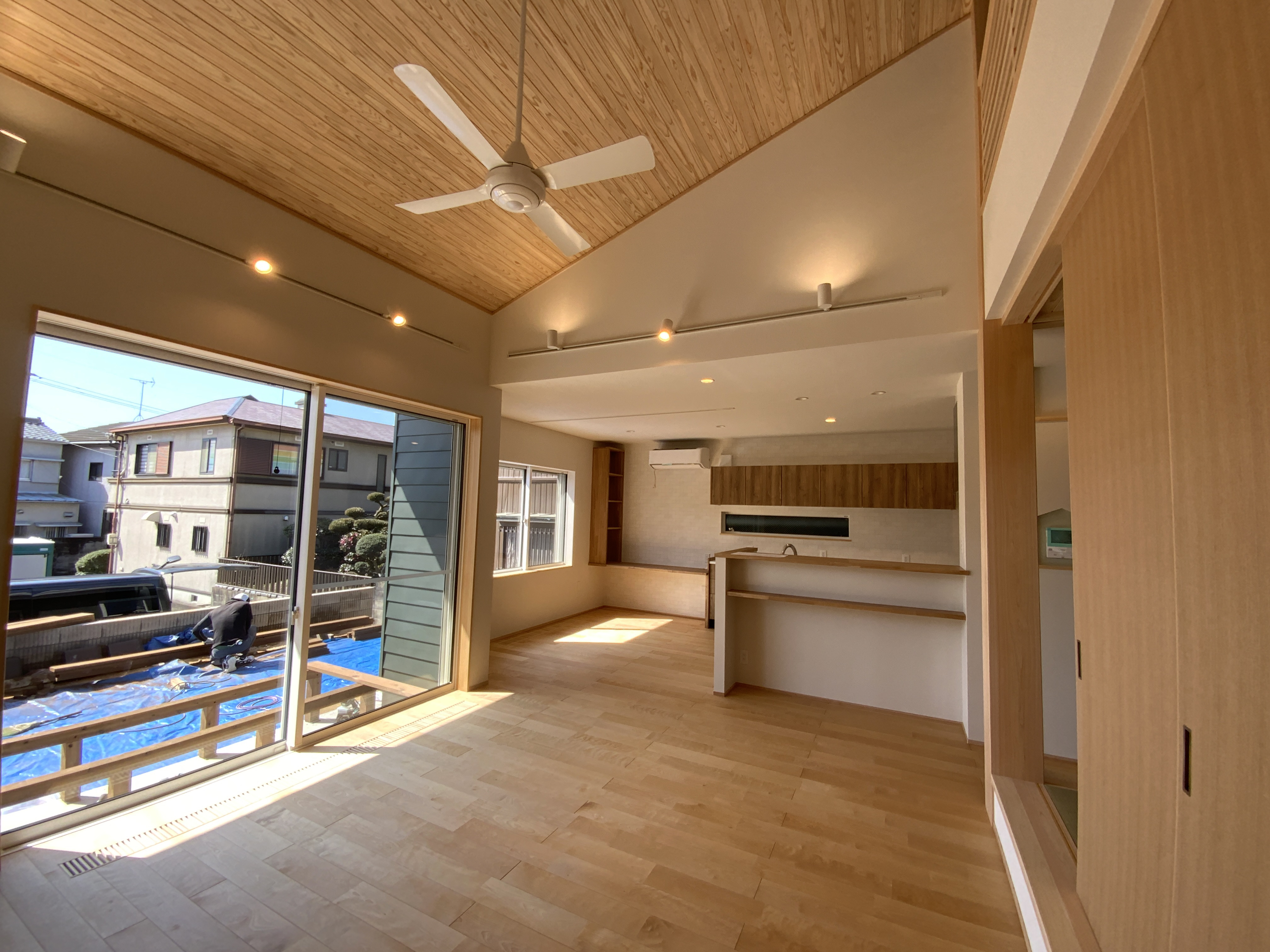 【延床面積】107.31㎡(32.46坪)/【工法】木造軸組工法/【断熱】基礎内:押出法ポリスチレンフォーム 外壁:高性能グラスウール 屋根・天井:セルロースファイバー/【換気】第1種換気/【屋根・外壁】屋根:ガルバリウム鋼鈑 外壁:サイディング・ガルバリウム鋼鈑【開口部】複合サッシ【内装】床:ナラ材・桧材 壁:エコクロス 天井:エコクロス、杉材/【UA値】0.37【ηA値】1.39【C値】0.4