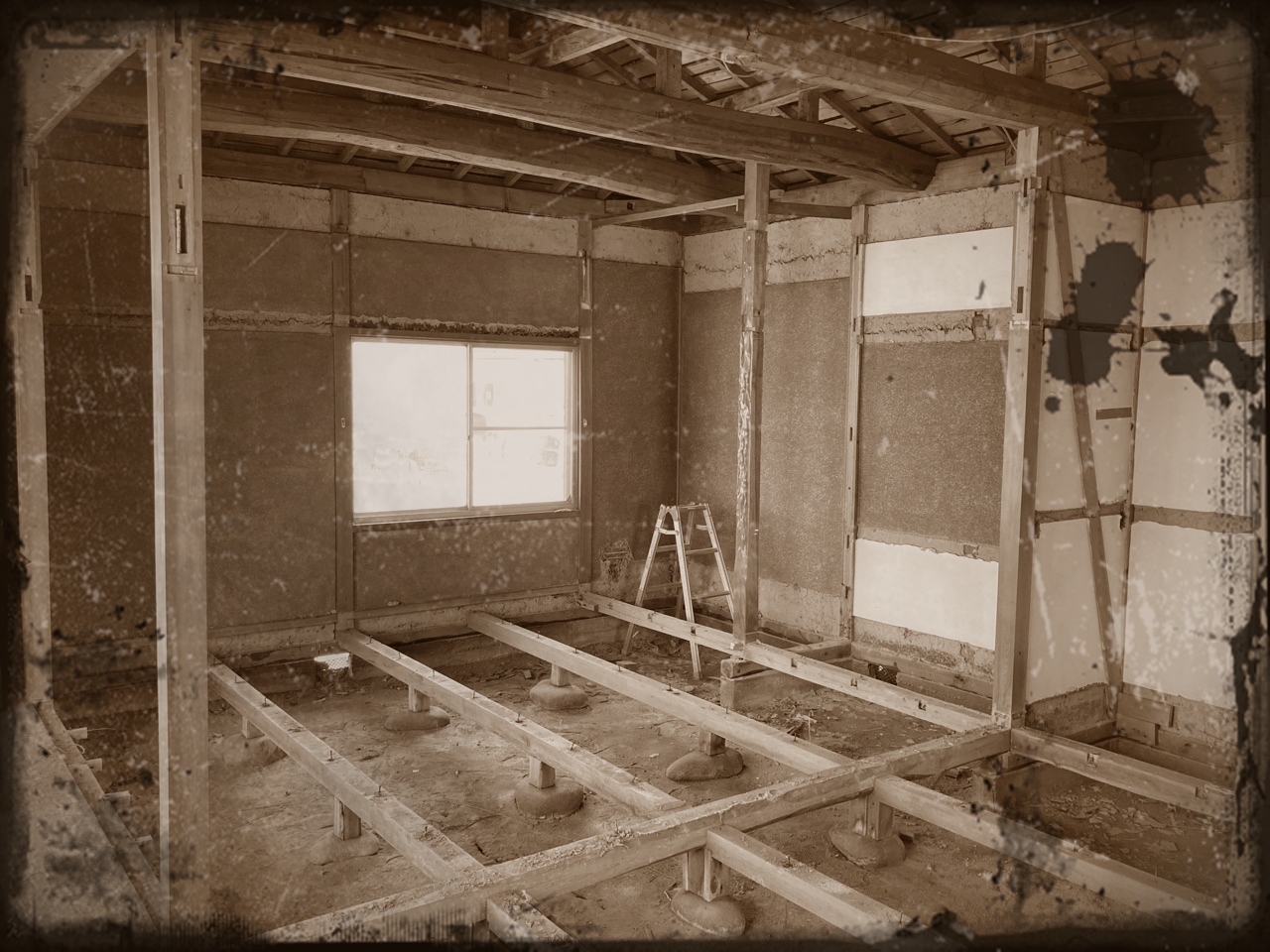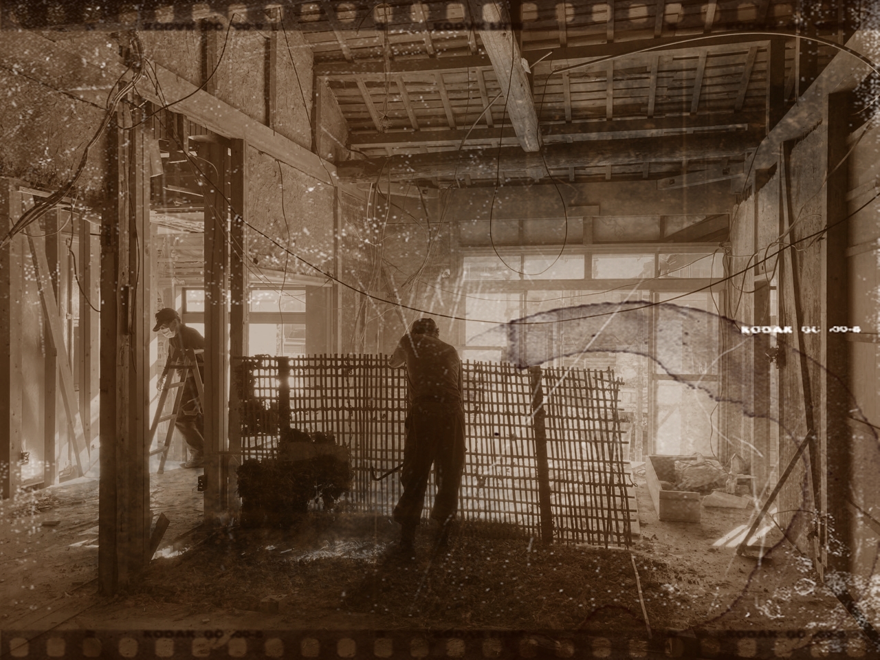 大正から昭和初期にかけて主屋、離れと建築されたこの建物、数々の地震や台風などを経ているものの当時の建主である先代のこだわりの賜物か、がっしりとした和小屋の軸組によって、古い民家にありがちな柱や鴨居の歪みなどがほとんどなく、現代までしっかりと守られてきていました。