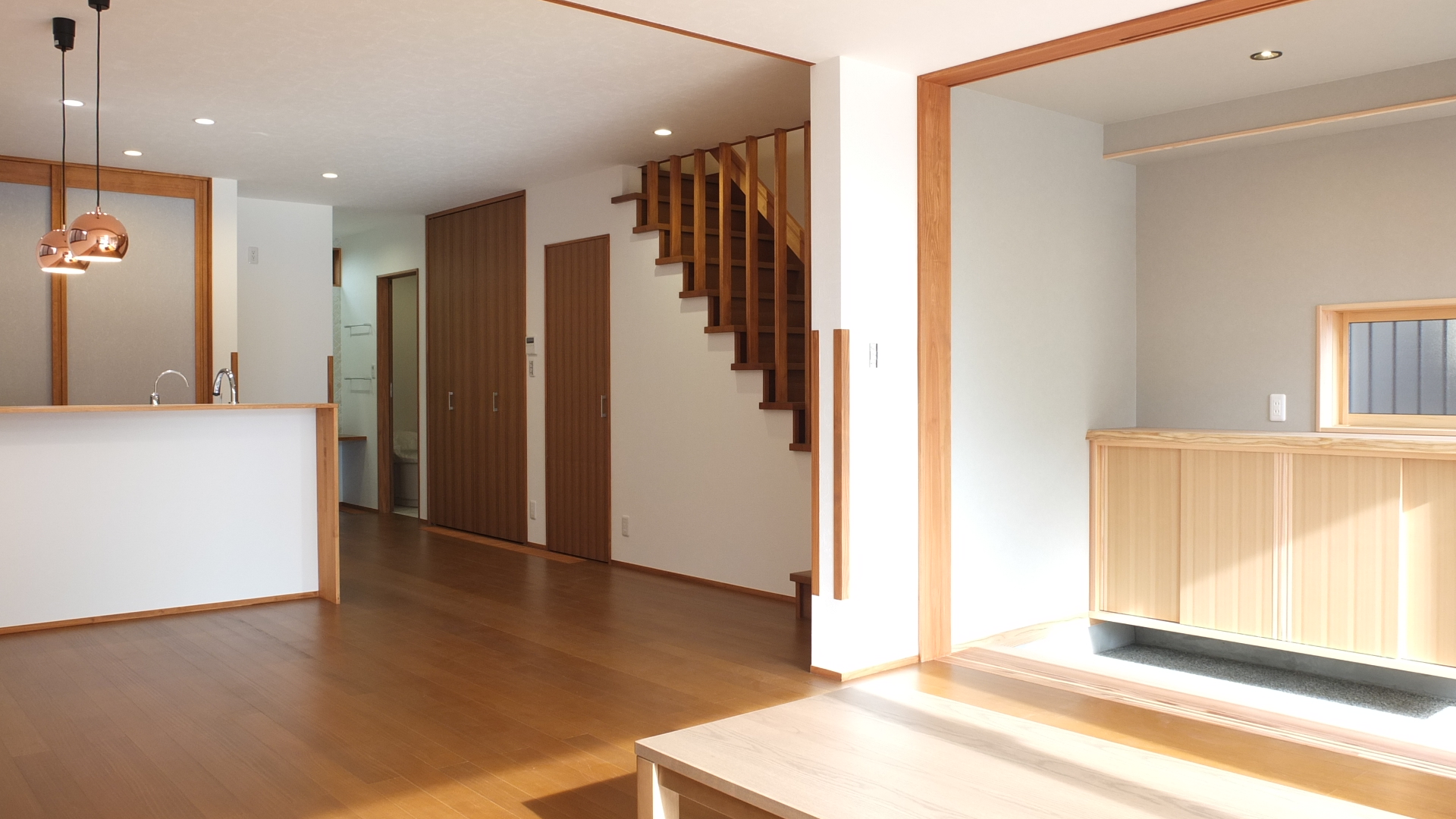h様ご家族はお仕事の都合のため名古屋市にお住まいでしたが、お子様が生まれて住宅新築検討を機に土地探しから始められ、最終的にご両親のお住まいも近いこの地に決められました。敷地面積は大きいのですが、一部間口の狭まった変形地。ここに建てるのならばこの間口を逆手にとって極力シンプルな外観をつくってみようと計画し、最終的には箱が2層に重なったような特徴的な外観に。その外観に合わせて内部インテリアも、なるべくシンプルに仕上がるように工夫を凝らしました。