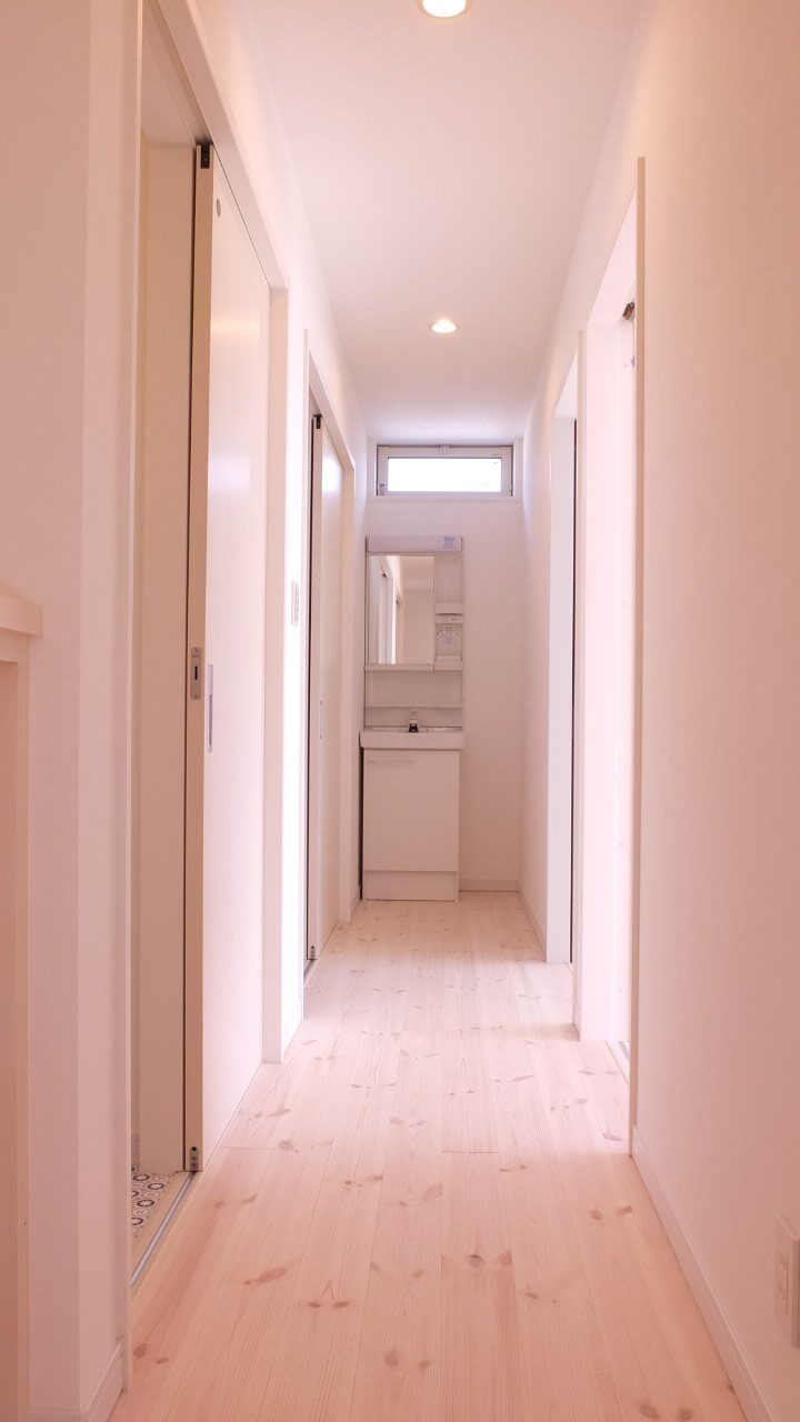 建築計画を進めていくにあたり、eh様は間取り、内装、構造など、できるだけシンプルなモノをご希望されました。特に内装は天井、壁、床、建具、設備に至るまで極力ホワイトで統一。まさに「白亜の」住宅となっています。ここに配する様々な家具、調度品、そしてh様ご家族の「生活」によって、この住宅がどのように色付けされていくかが楽しみです。
