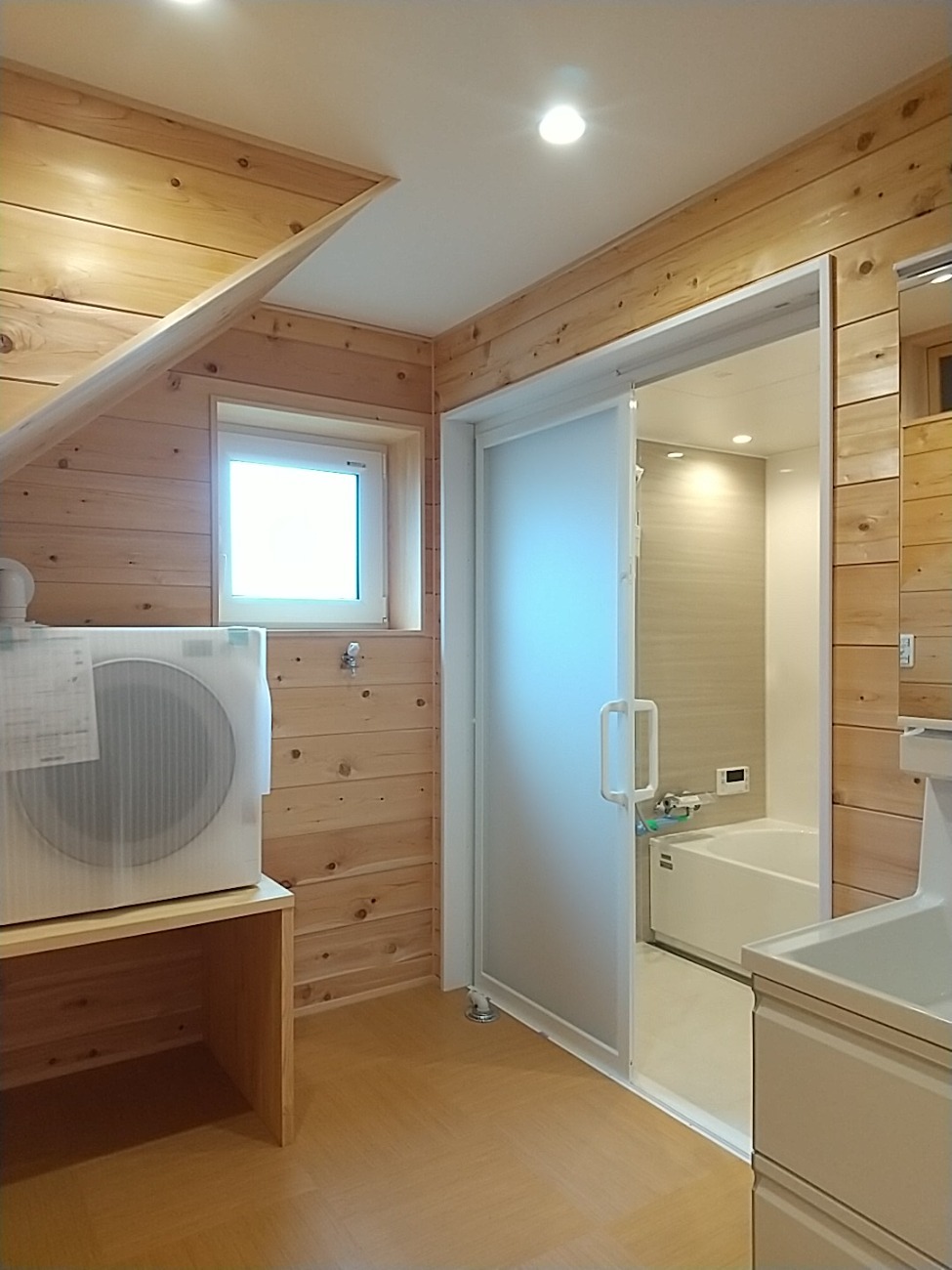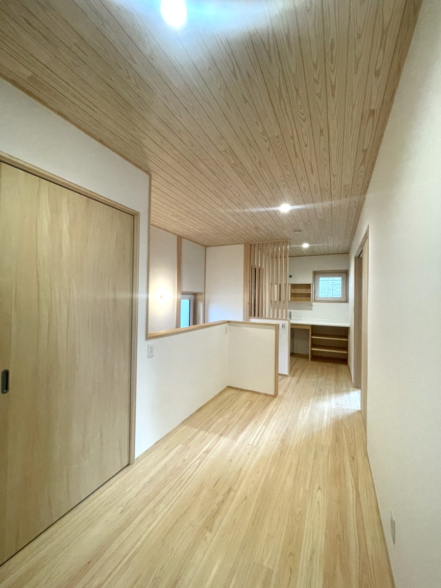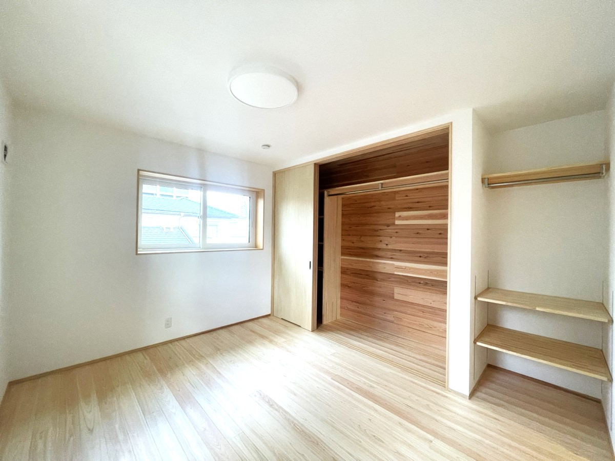 [内装]床:カバ材、塩ビフロアタイル 内壁:エコクロス貼、サワラ材 天井:エコクロス貼、杉材、桧材