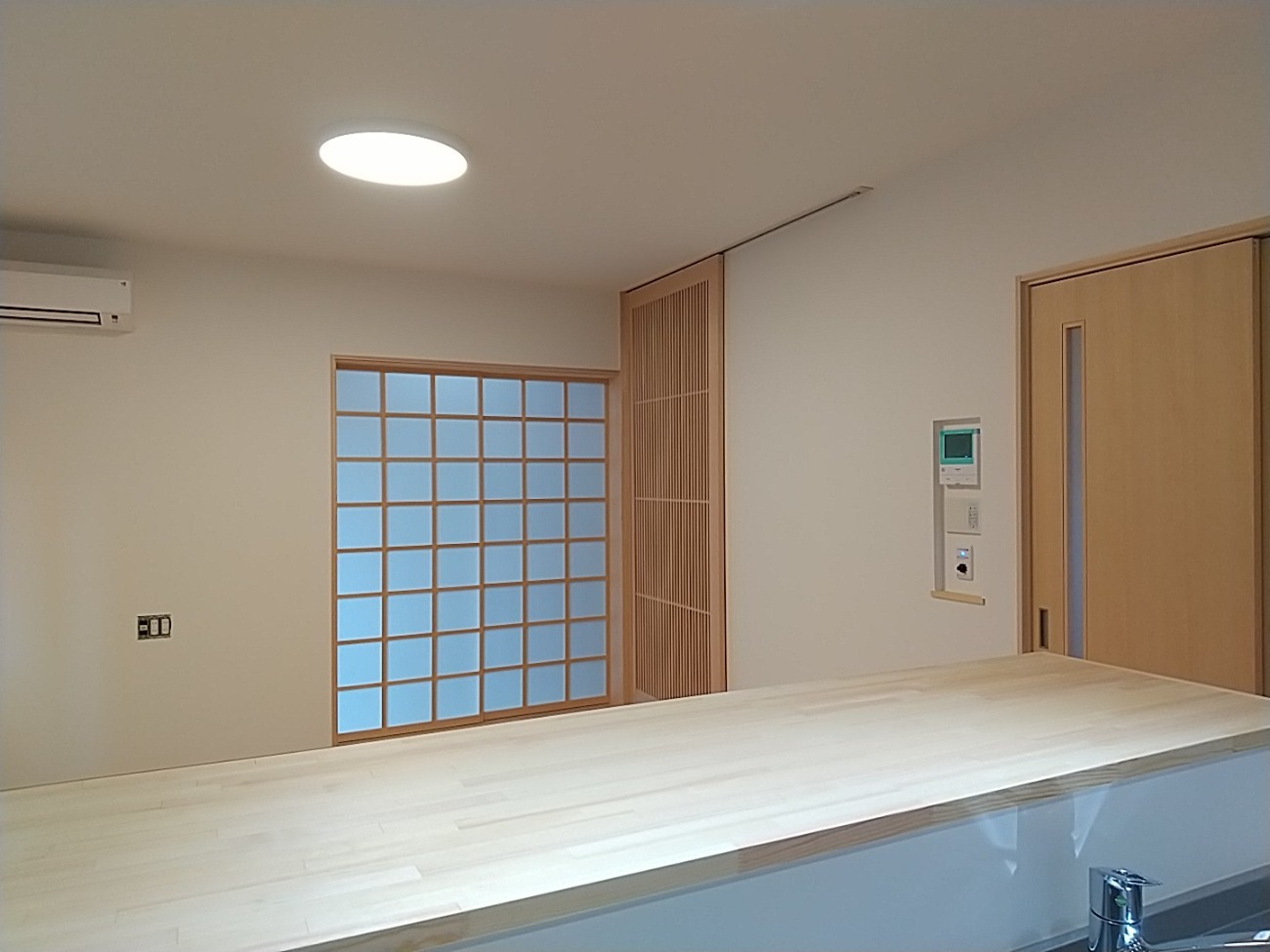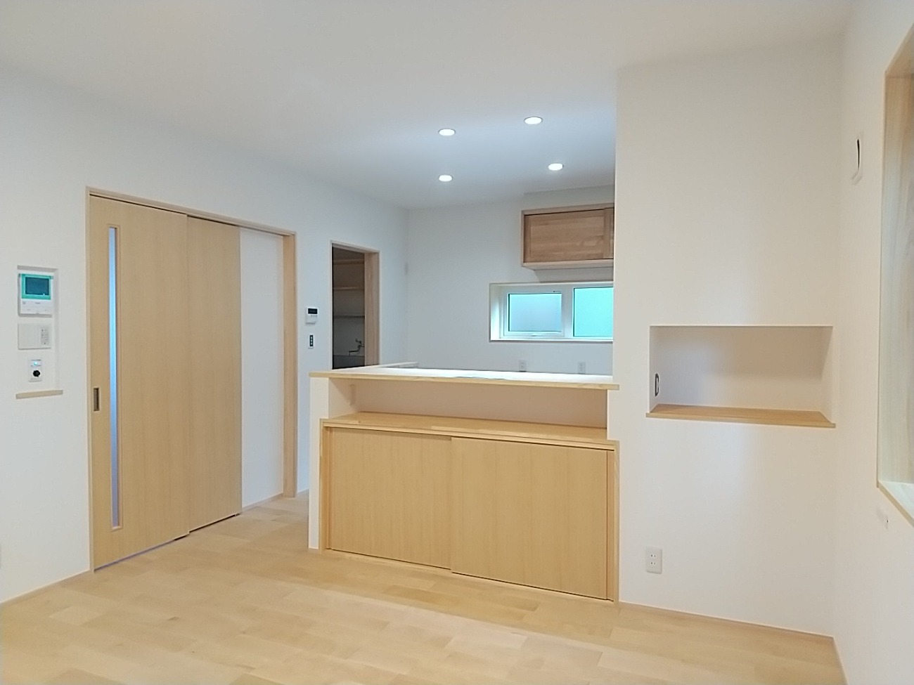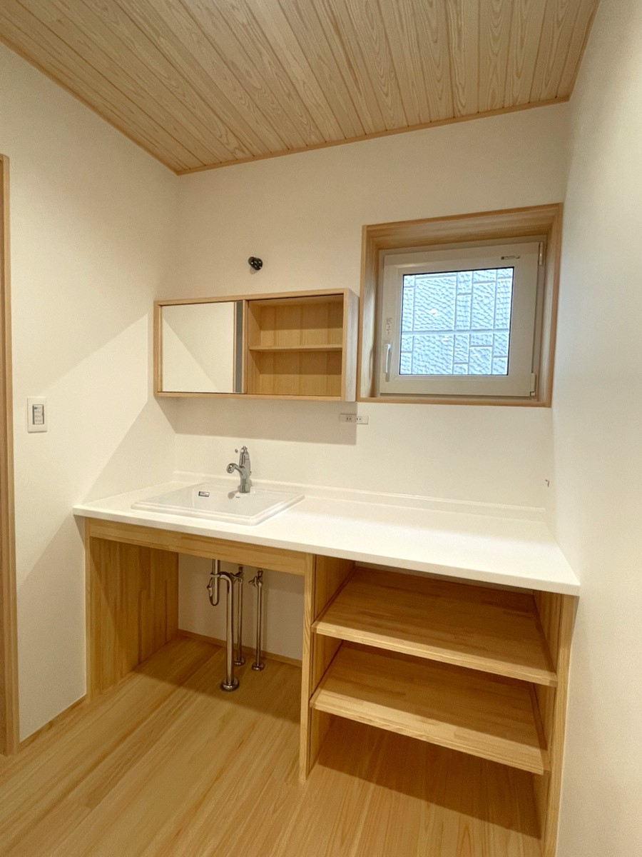 [内装]床:カバ材、塩ビフロアタイル 内壁:エコクロス貼、サワラ材 天井:エコクロス貼、杉材、桧材