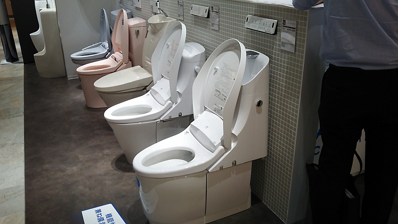 トイレ設備の実機が展示されています。最近のトイレは実に清潔にかつ、お掃除がしやすく改良に改良を重ねられています。華やかなショールームの展示の裏に開発者、技術者たちの努力があると思うと、トイレとは言え輝いて見える・・・というのは照明の具合でしょうか。