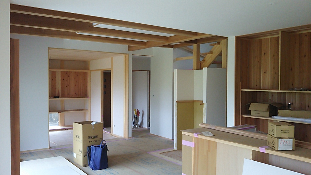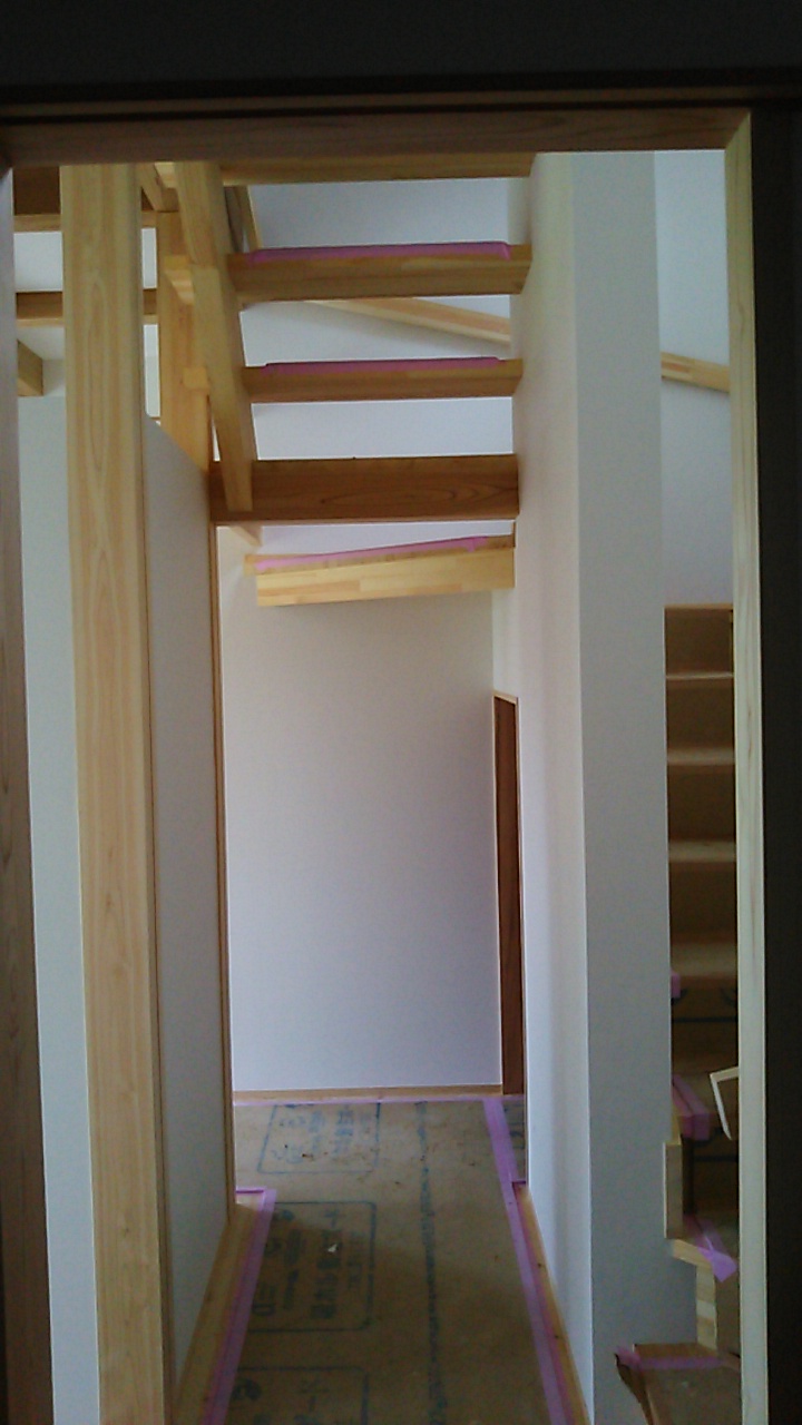 内部のクロス工事が終了しています。壁面の白と木材の色とのコントラストがなかなか美しい。