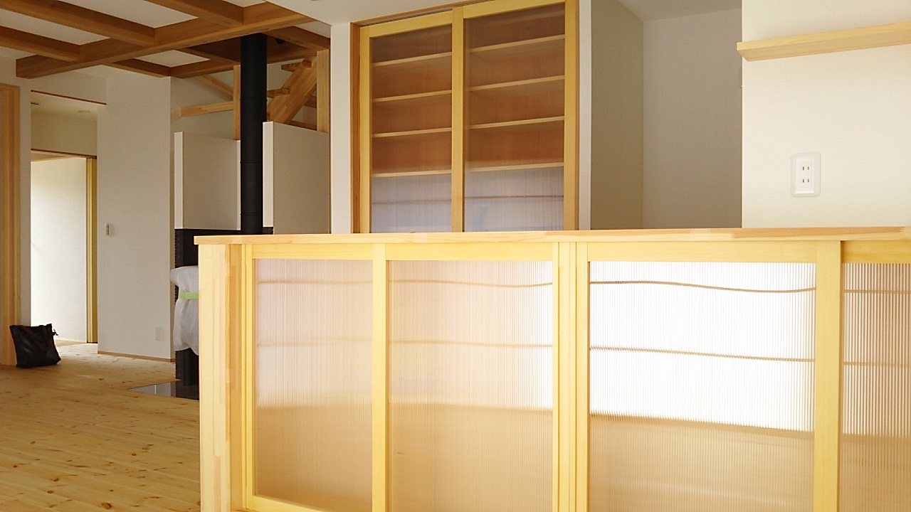 キッチン周りには『中空ポリカーボネート板』を使用しました。(写真では見づらい?)詳細はぜひ見学会にて。